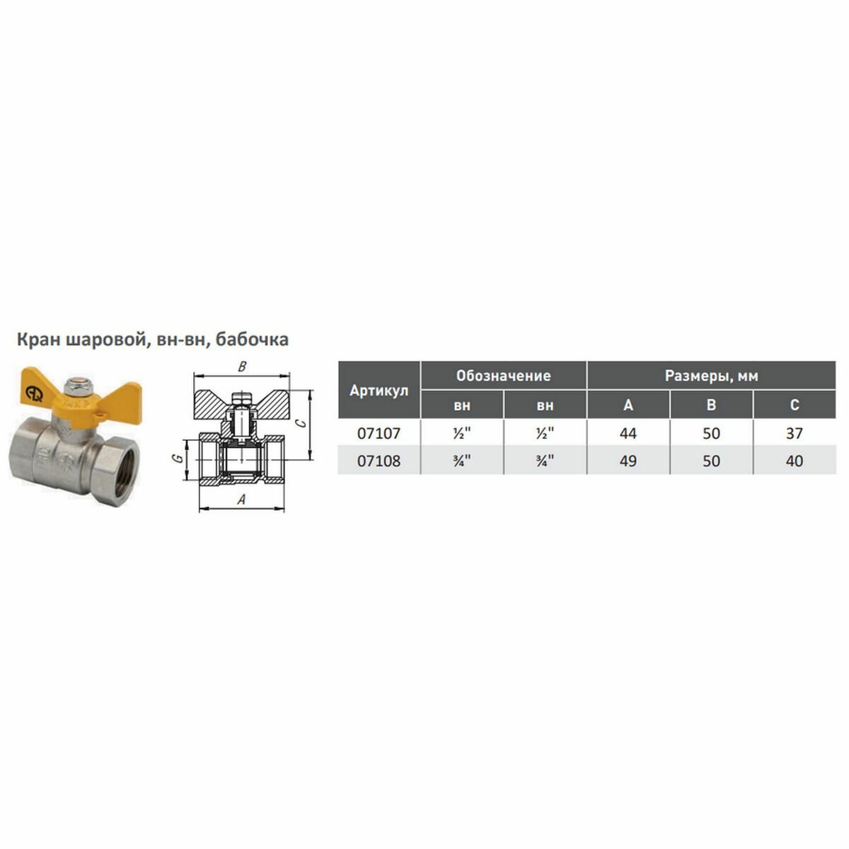 Кран шаровой вн-вн 1/2", ручка-бабочка