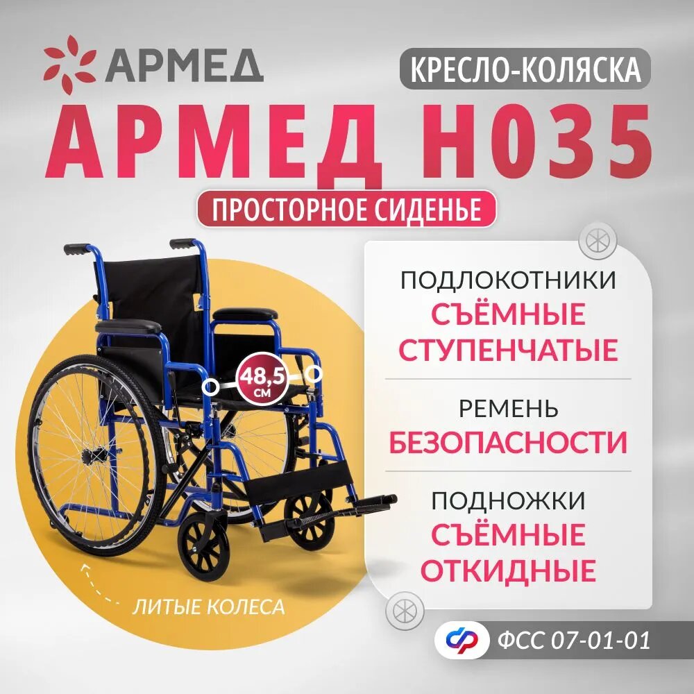 Инвалидная кресло-коляска Армед H 035 (ширина сиденья 48 см, литые колеса, для взрослых и пожилых) интересное: