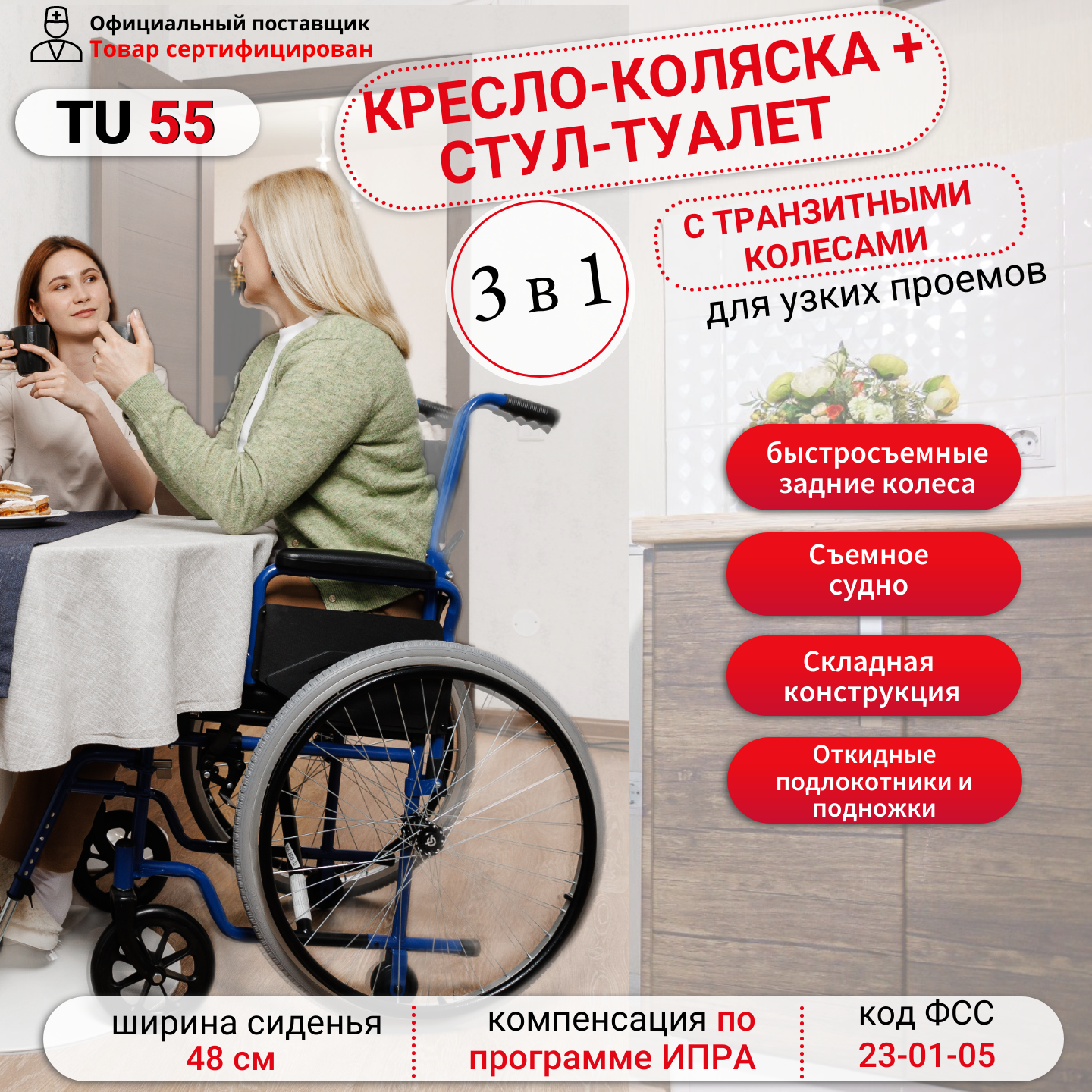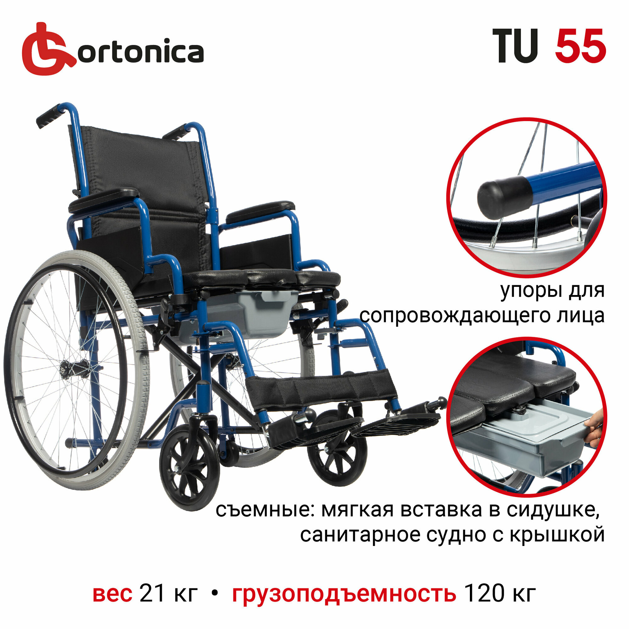 Купить Кресло-коляска - туалет Ortonica TU 55 складное для инвалидов и пожилых людей со съемным санитарным оснащением ширина сиденья 48 см Код ФСС 23-01-05