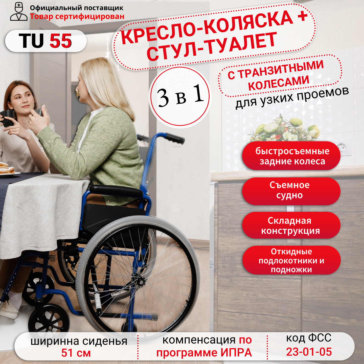 Кресло - коляска - туалет Ortonica TU 55 складное для инвалидов и пожилых людей со съемным санитарным оснащением ширина сиденья 46 см Код ФСС 23-01-05
