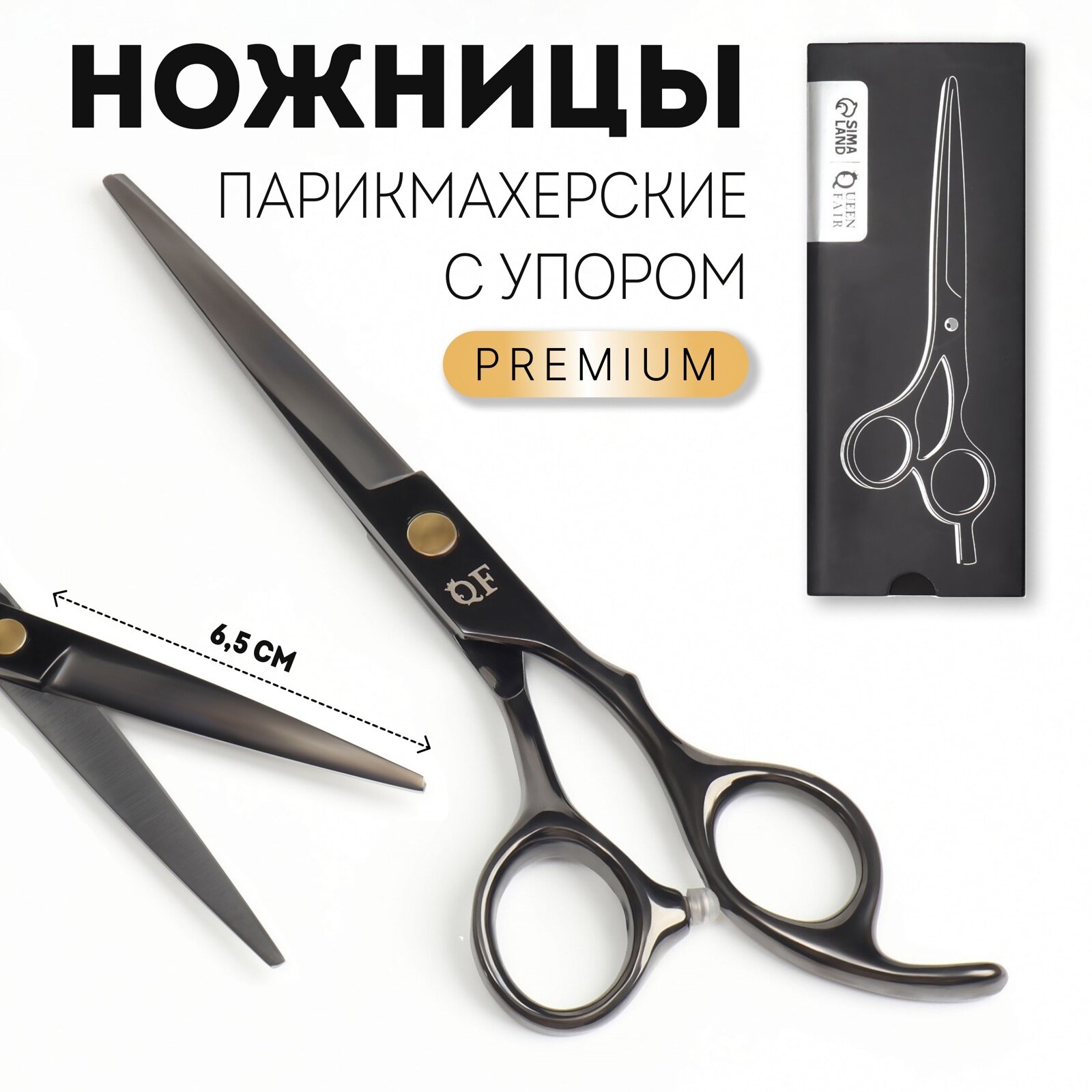 Купить Ножницы парикмахерские с упором «Premium», загнутые кольца, лезвие — 6,5 см, цвет чёрный (1шт.)