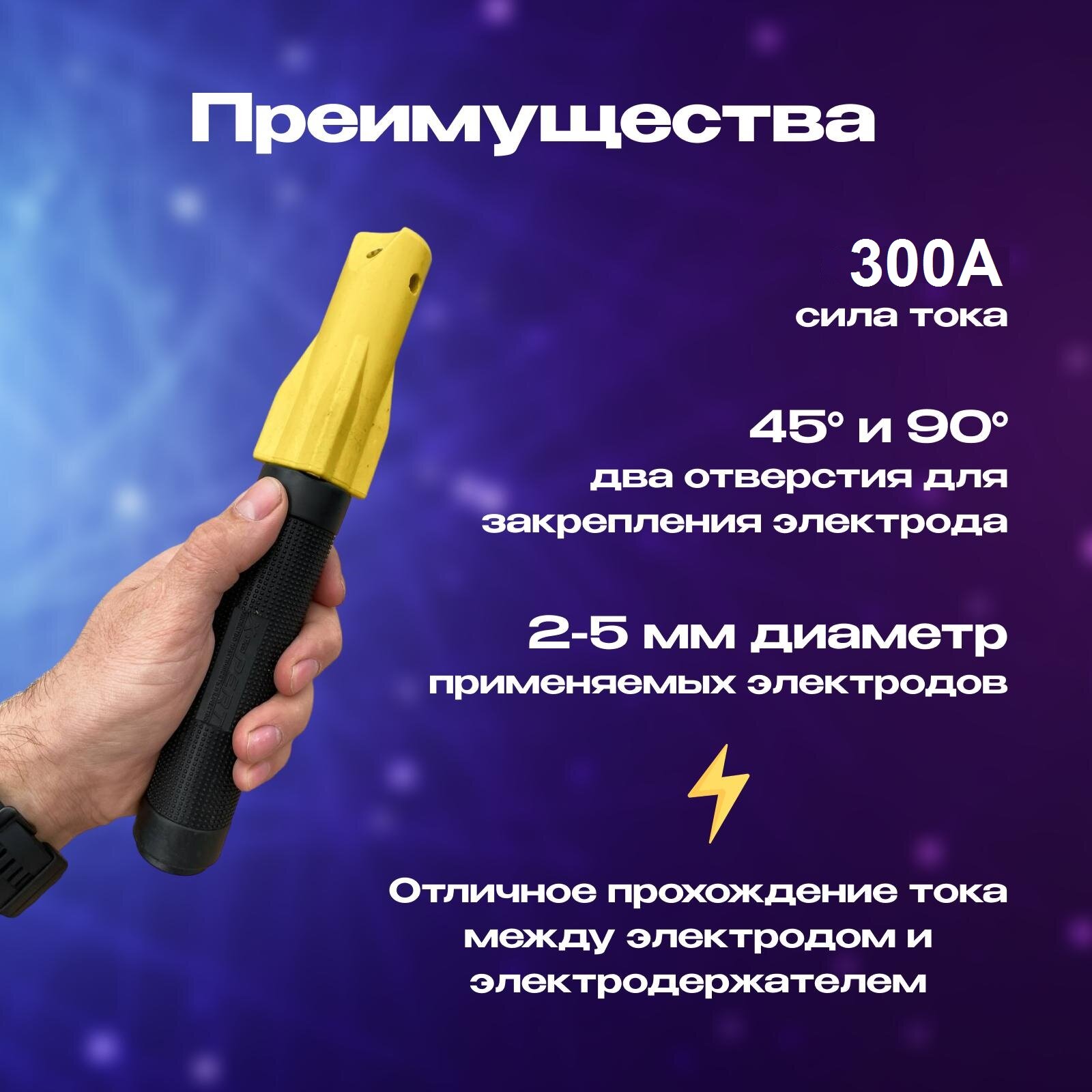 | Дополнительная информация | Электрододержатель - аксессуар для ручной дуговой сварки, который удерживает электрод во время проведения сварочных работ. Электрод можно установить в под углом 45° или 90° в зависимости от требуемых задач. Конструкция винтового типа позволяет удобно, быстро и надежно зафиксировать электрод. |