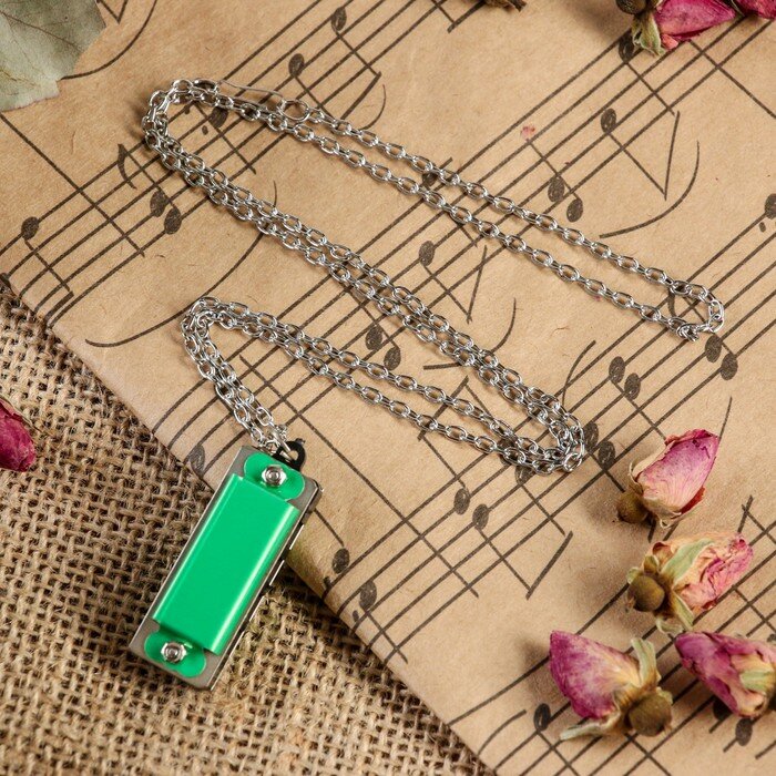 Купить Губная гармошка 4 отверстия, 8 тонов, 3,5х1,5х1см, цепь 28см, зеленая