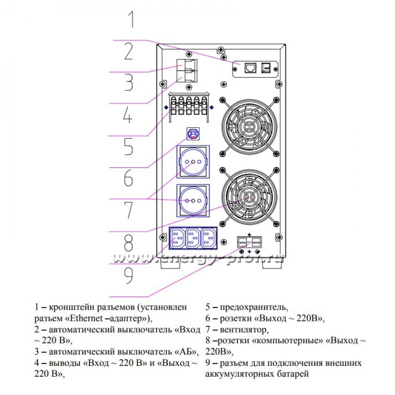 | Дополнительная информация | без внутренних АКБ; интерфейсы приобретаются отдельно (RS-232, USB, непрограммируемые и программируемые «сухие» контакты, Ethernet (поддержка протоколов eb/SNMP/SMTP/Modbus TCP и др.) и RS-485 (протокол Modbus RTU), порт EPO для дистанционного аварийного отключения); выходные разъемы IEC-320-C13 (3 шт.), EURO F-type с заземлением (2 шт.), |
