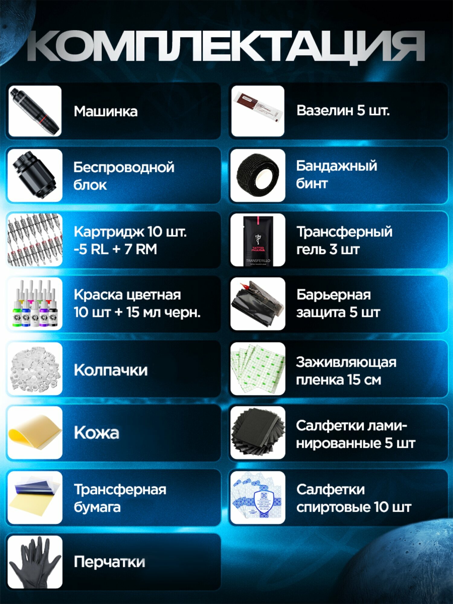 | Комплектация | беспроводной блок - 1шт. машинка - 1шт. картриджи - 10шт. краска цветная - 10шт. краска черная - 1шт. кожа - 1шт. перчатки - 1шт. вазелин - 5шт. бандажный бинт - 1шт. барьерная защита - 5шт. заживляющая пленка - 15см. трансферная бумага - 1шт. трансферный гель - 3шт. салфетки спиртовые - 5шт. колпачки, коврик для стола - 5шт. |