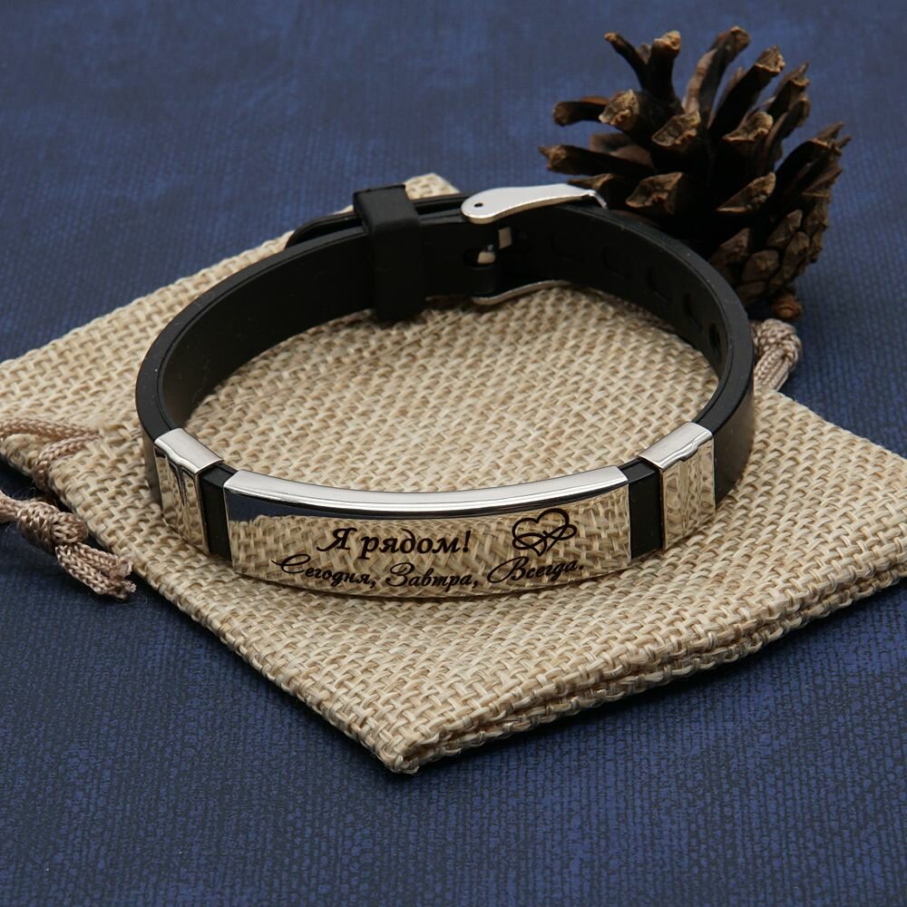 СохранитьБраслет с гравировкой "Я рядом", стальная вставка, подарочный мешочек (подарок любимому, мужу, парню, мужчине на день рождения, день свадьбы, юбилей, годовщину свадьбы, 23 Февраля) интересное:
