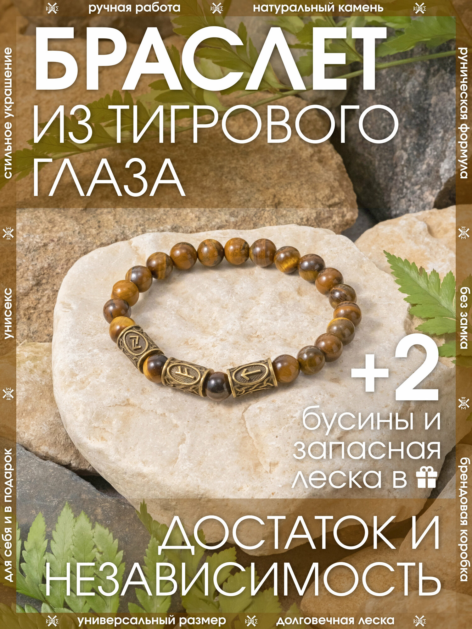 Купить Браслет-оберег из натурального камня Тигровый Глаз/Формула обогащения, талисман с рунами из латуни/Браслет из бусин, бижутерия, украшение
