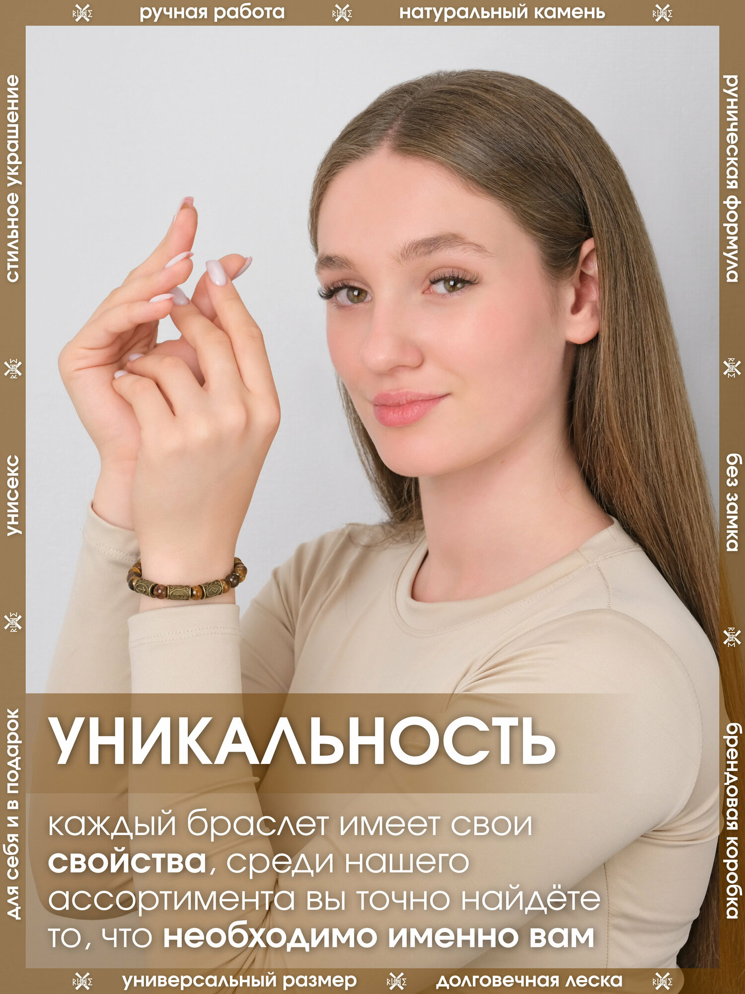 Браслет из натуральный камней/Оберег на руку из унакита/Талисман-амулет с рунами женский, мужской/Украшение из бусин