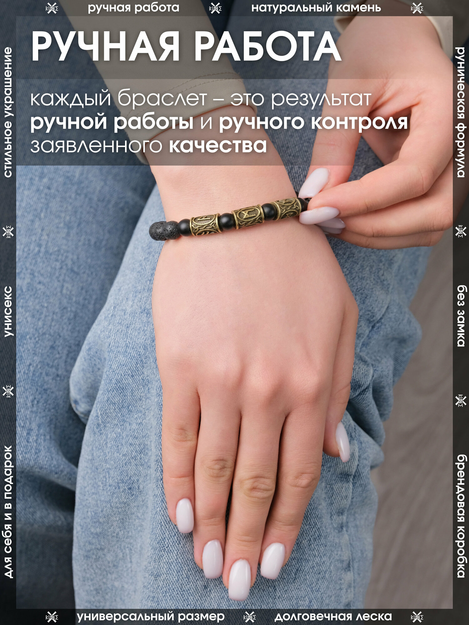 Браслет-оберег из натурального камня Лава и Яшма/Руническая формула снятия негатива, талисман с рунами из латуни/Чёрный браслет из бусин, бижутерия