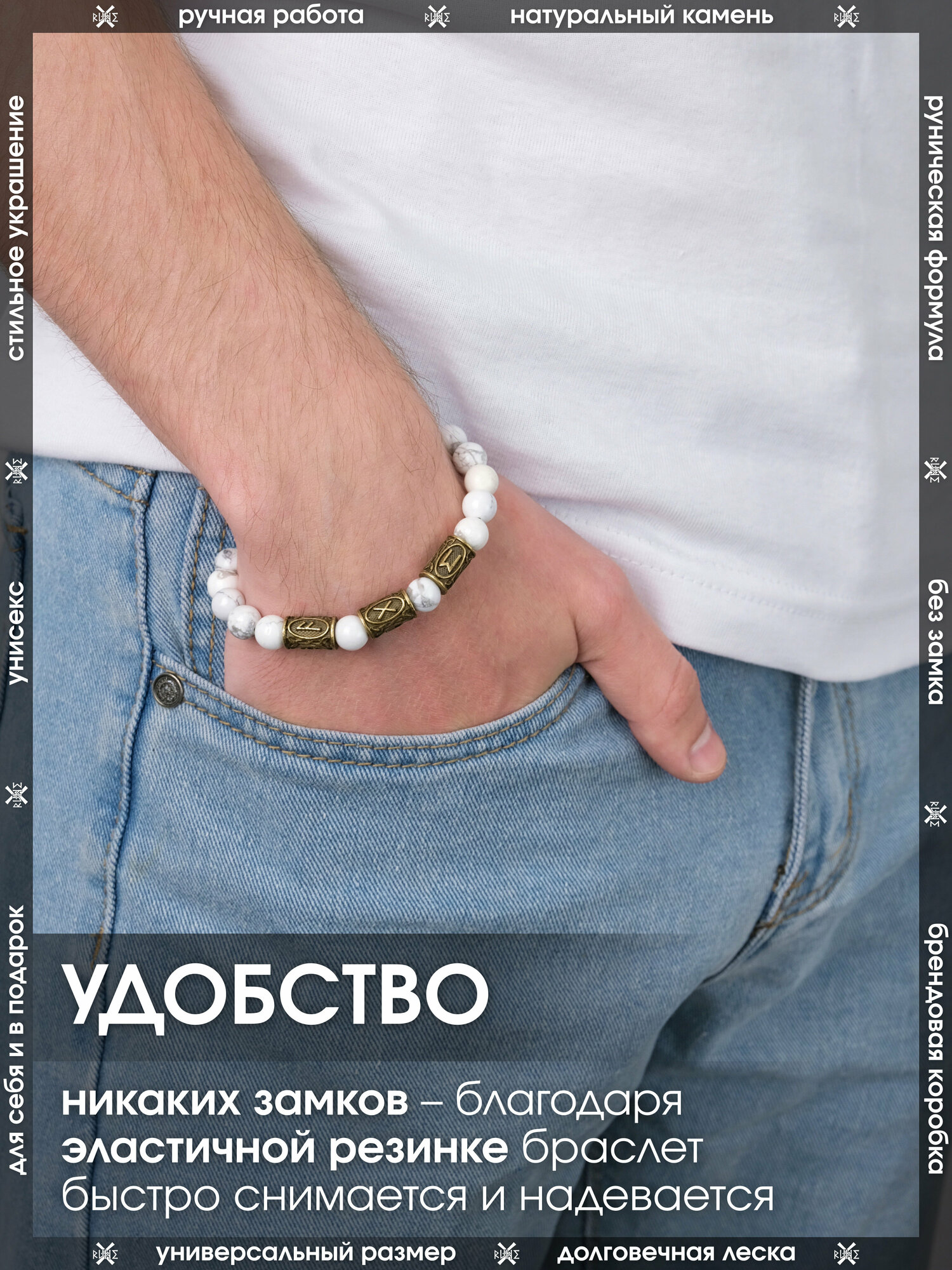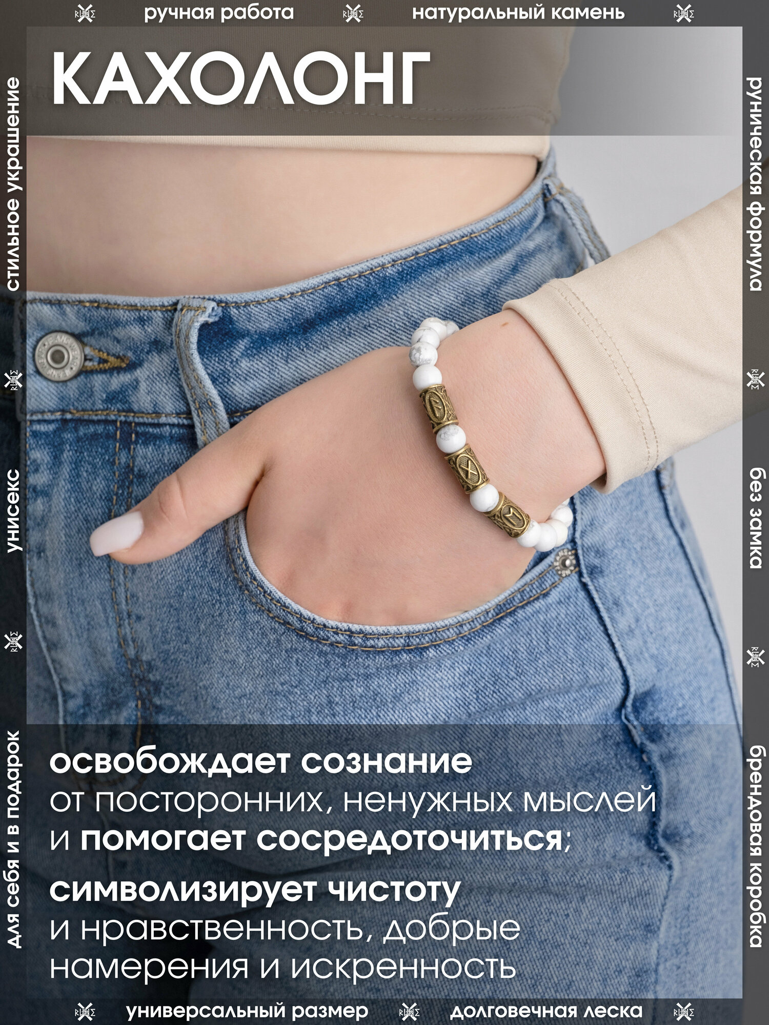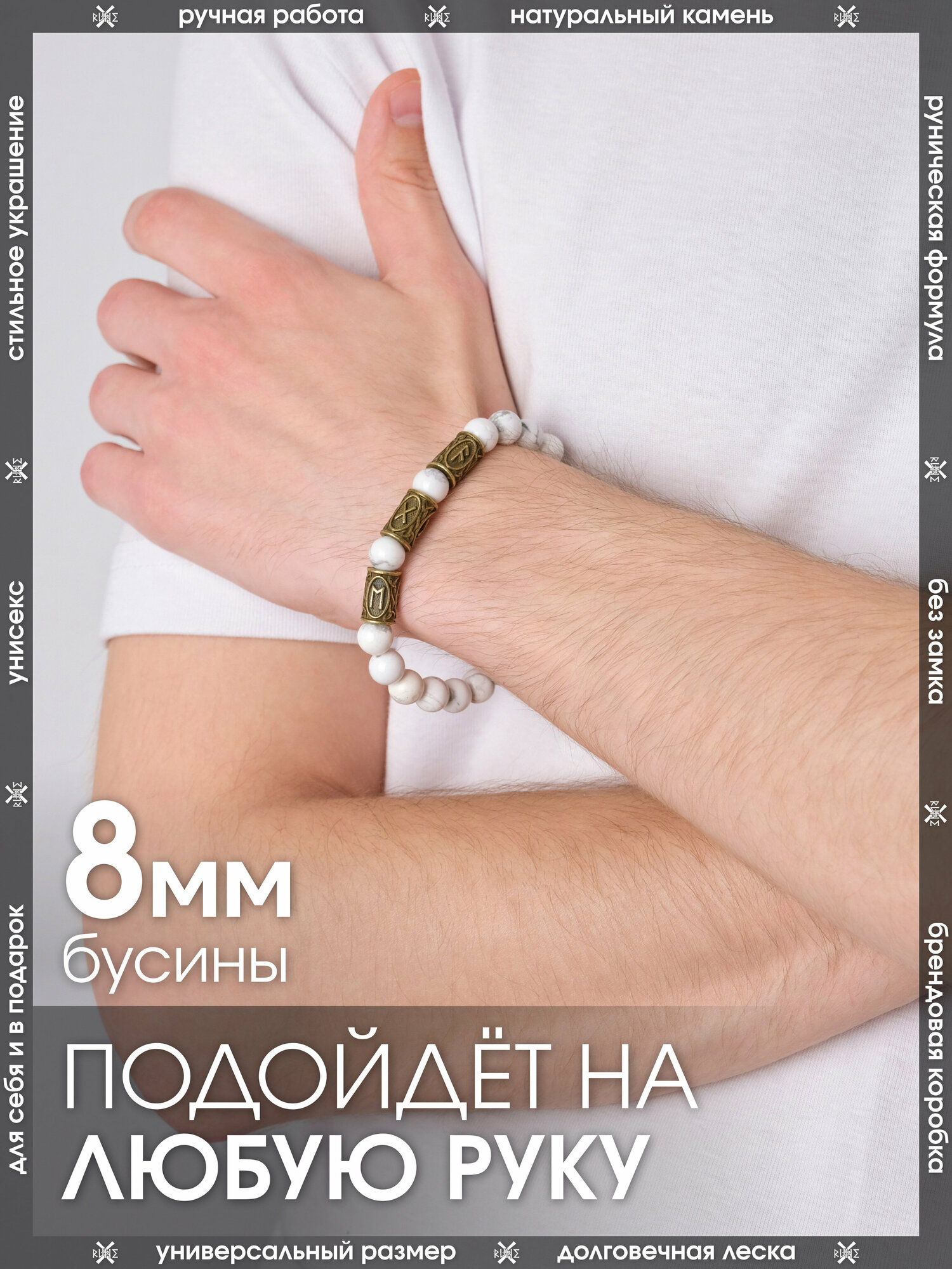 Купить Браслет-оберег из натурального камня Кахолонг/Руническая формула укрепления семьи, талисман с рунами из латуни/Белый браслет из бусин, бижутерия