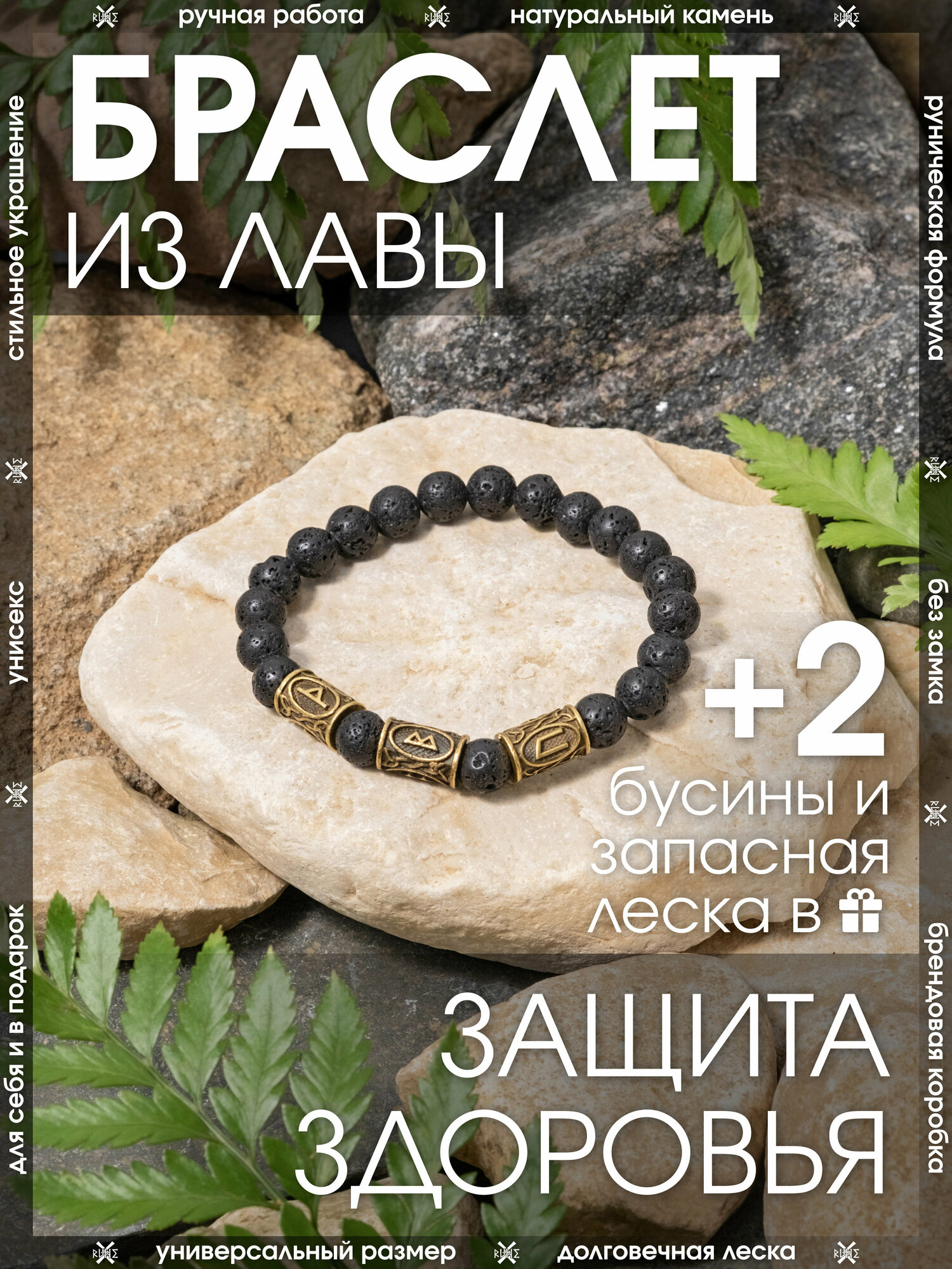 Купить Браслет из натурального камня Лава (базальт)/Руническая формула защиты здоровья/Чёрный браслет-оберег, бижутерия