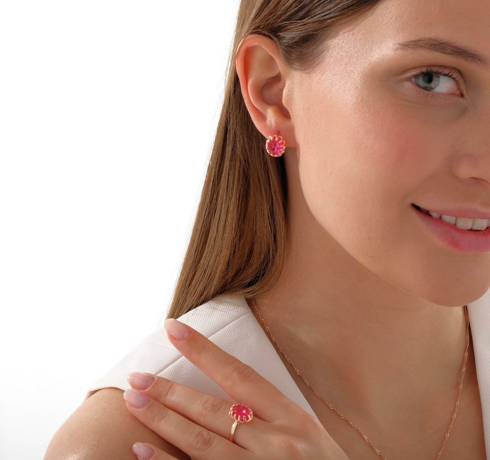 | Название модели | Гарнитур 3 предмета: серьги, кулон, кольцо безразмерное Эдель овал, цвет ярко-розовый в золоте, 45см |