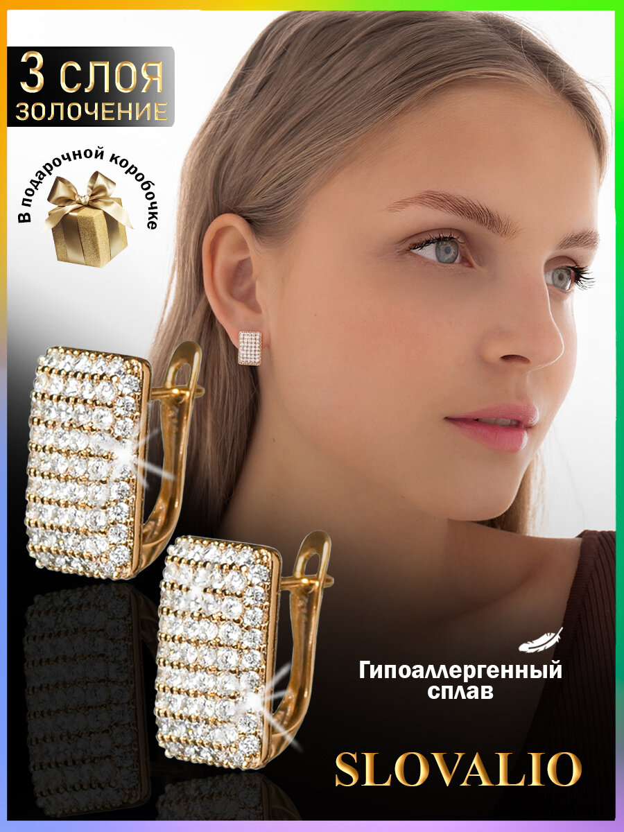 Серьги-конго SLOVALIO 3-рядные, золотые, с фианитами, 22мм, подарочная коробка