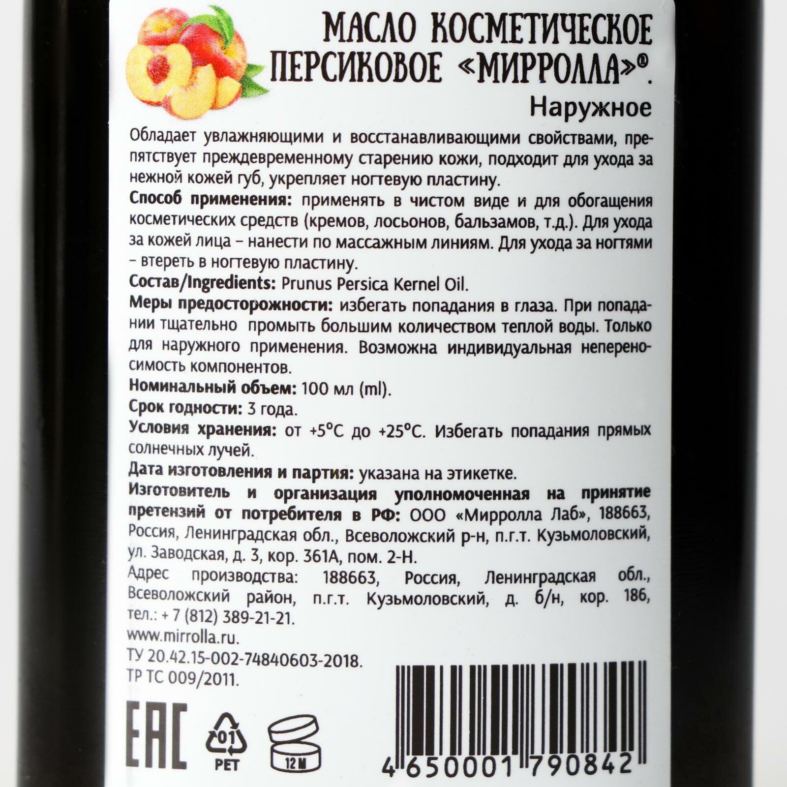 Масло косметическое Персиковое Mirrolla, 100 мл. 4306585