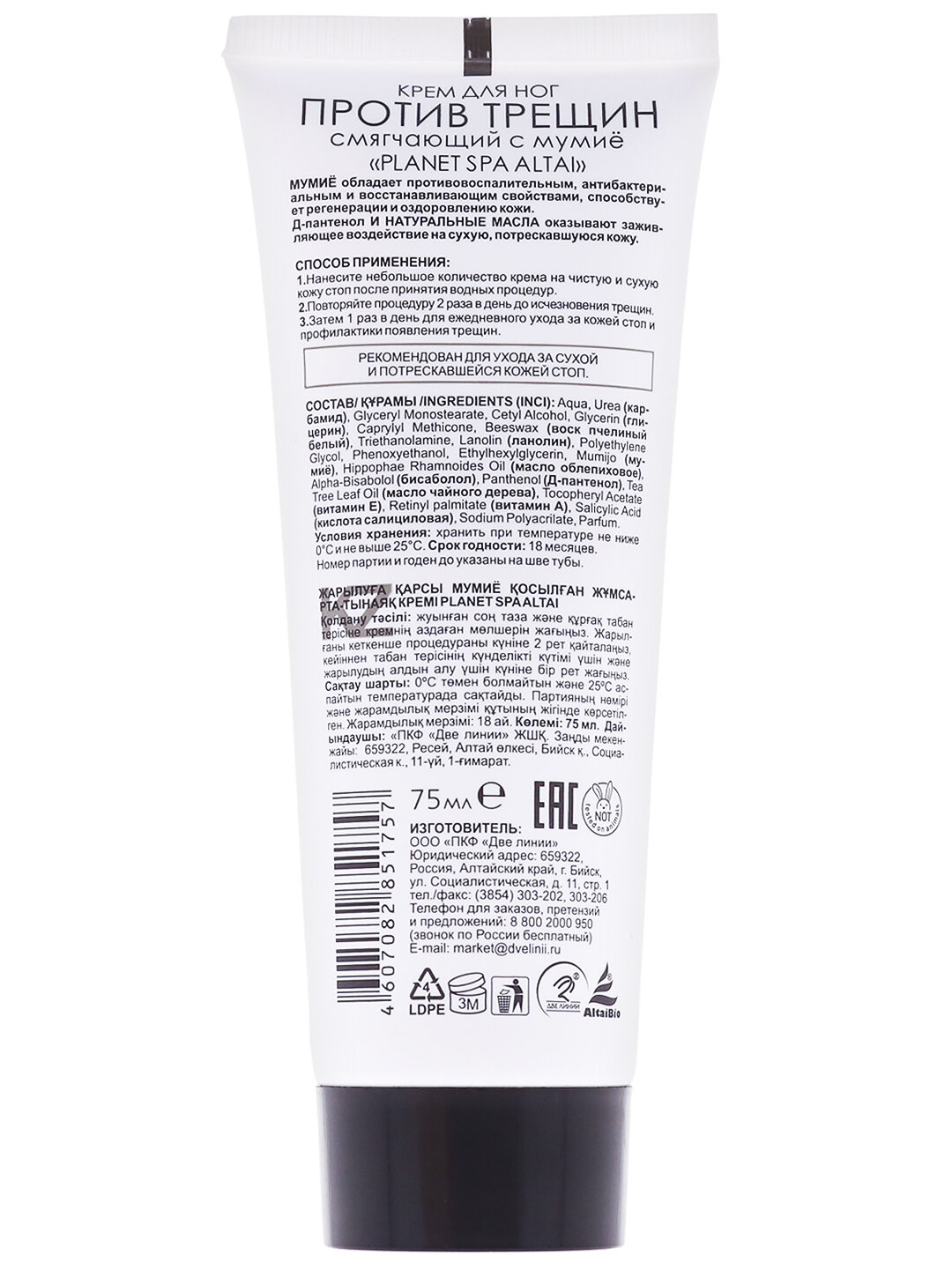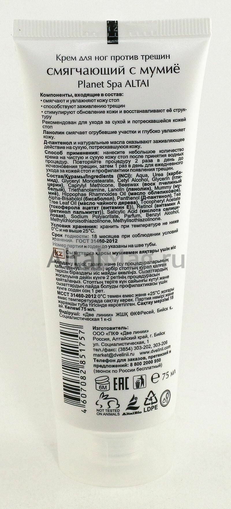 Planet SPA Altai Крем для ног против трещин смягчающий с мумиё, 75 мл, Две линии