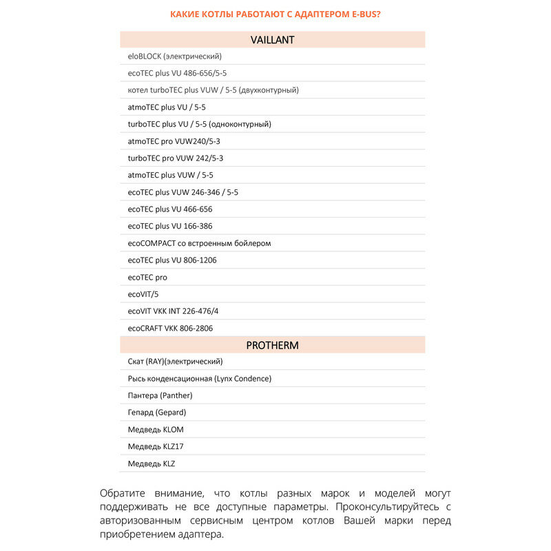 | Совместимые модели | Работа с котлами Vaillant, Protherm, Ariston и другими, поддерживающими eBUS |
