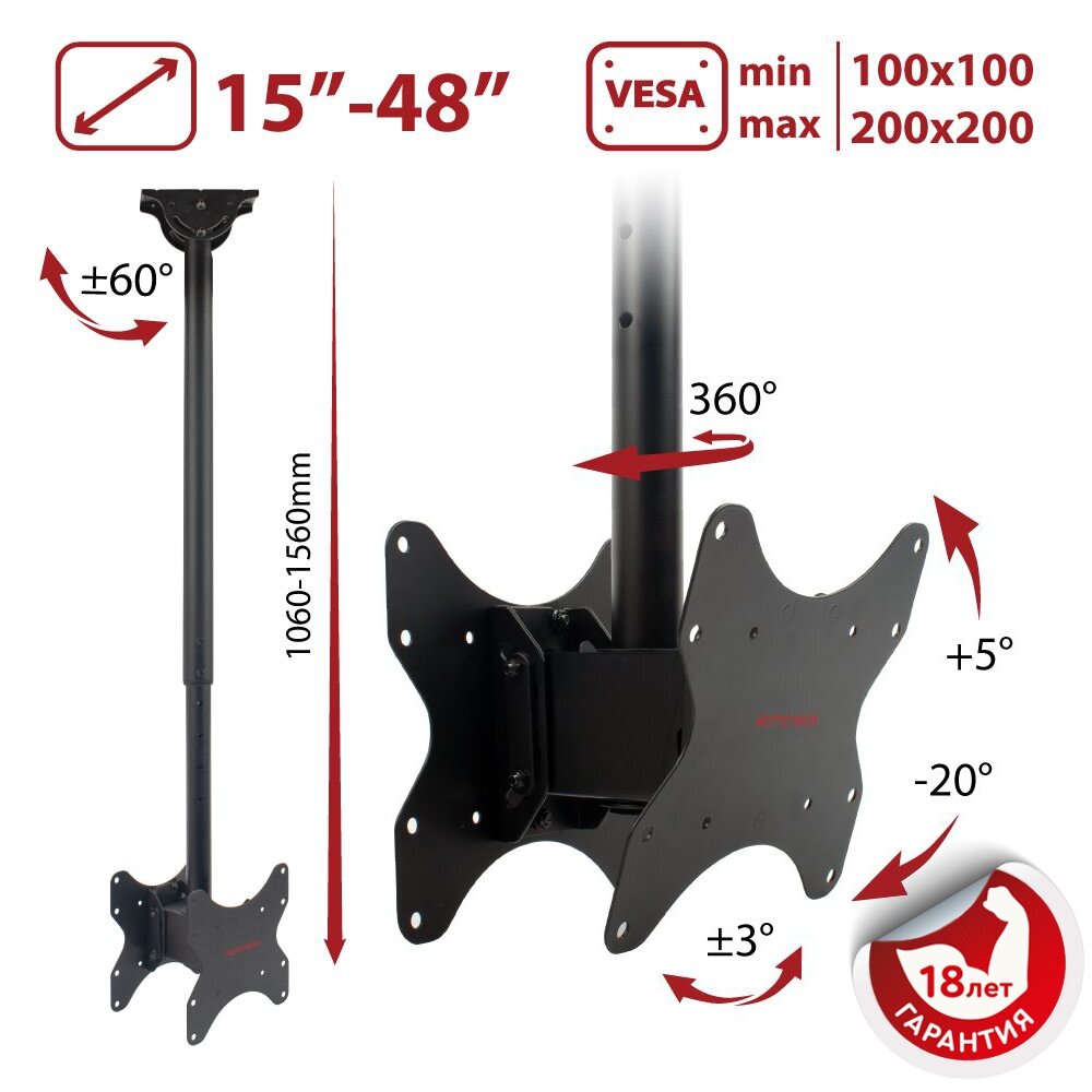 Кронштейны для техники ARM MEDIA Кронштейн потолочный ARM MEDIA LCD-1650 15-48" (наклон +5 -20°, поворот ±180°, до 2 х 45 кг, черный)