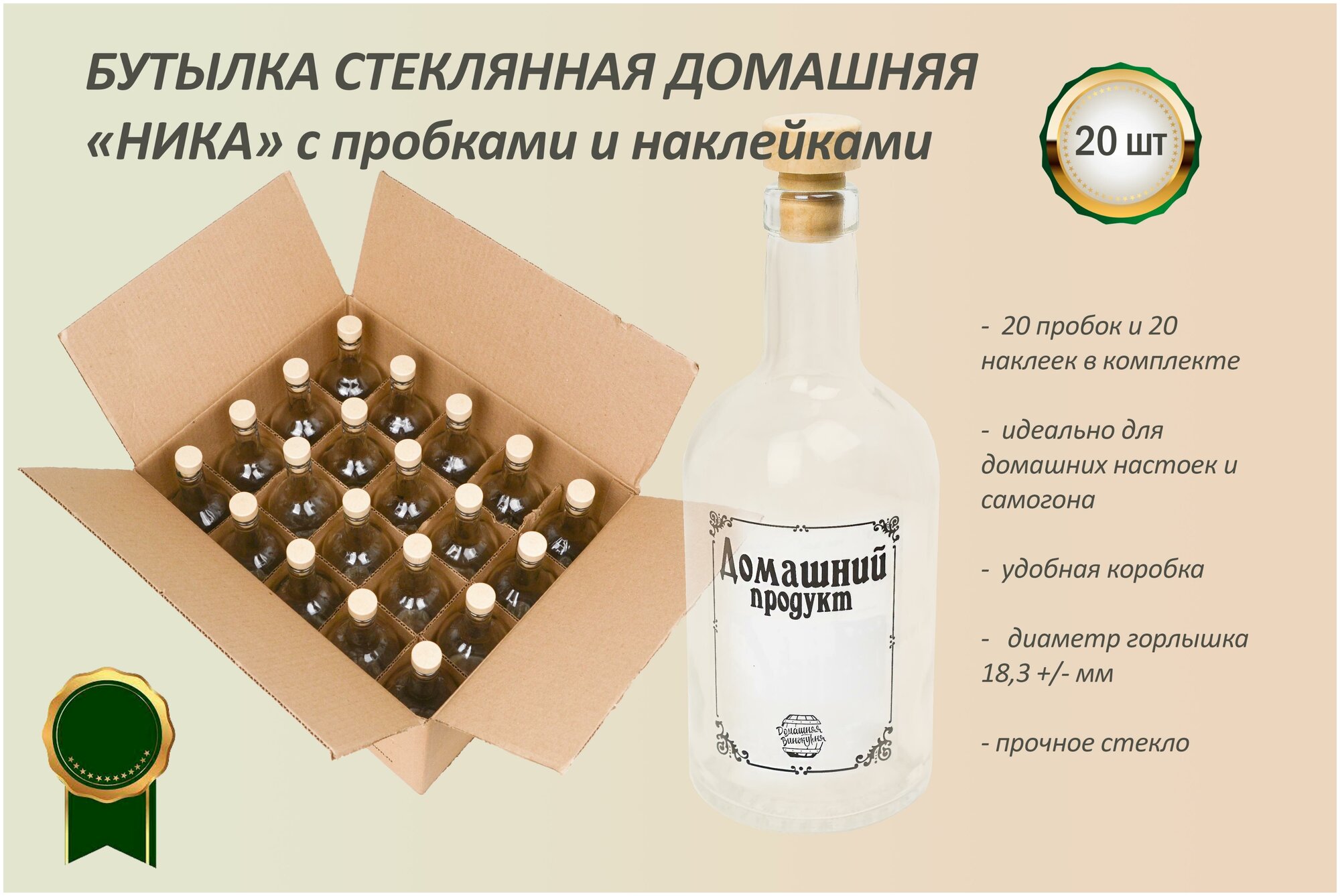 Купить Бутылка стеклянная Домашняя "Ника" с комплектом Т-образных пробок и наклеек "Домашний продукт" (20 штук)