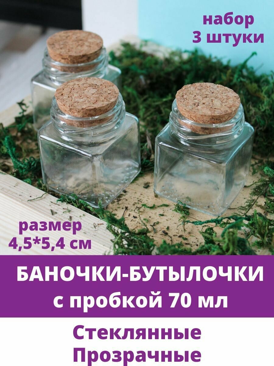 Купить Баночки - бутылочки с пробкой, стеклянные, прозрачные 70 мл, 4,5*5,4 см, набор 3 штуки