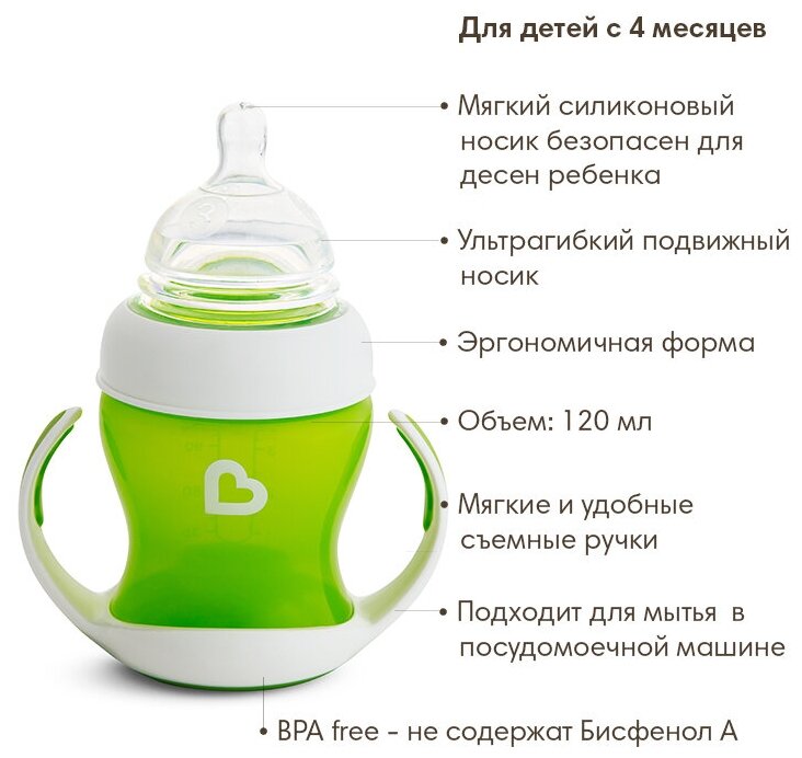 СохранитьMunchkin обучающий поильник-чашка Gentle™ с ручками зелёный 4+ 120мл. интересное: