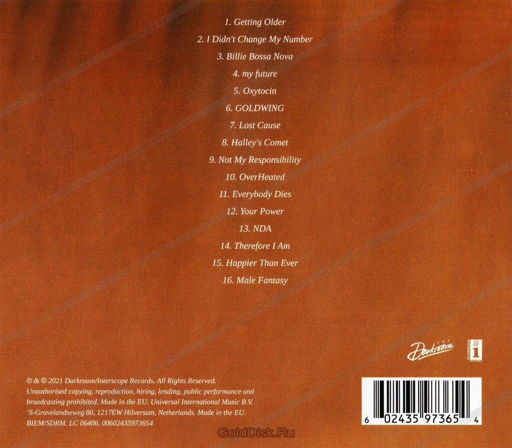 | Треклист | 1 Getting Older 4:04 2 I Didn't Change My Number 2:38 3 Billie Bossa Nova 3:16 4 My Future 3:30 5 Oxytocin 3:30 6 Goldwing 2:31 7 Lost Cause 3:32 8 Halley's Comet 3:54 9 Not My Responsibility 3:47 10 Overheated 3:34 11 Everybody Dies 3:26 12 Your Power 4:05 13 NDA 3:15 14 Therefore I Am 2:53 15 Happier Than Ever 4:58 16 Male Fantasy 3:14 |