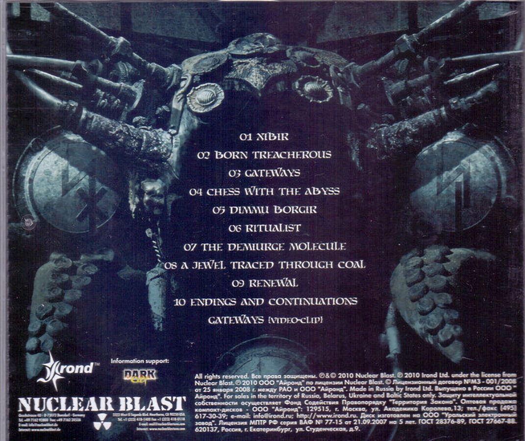 | Треклист | 1. Xibir 2. Born Treacherous 3. Gateways 4. Chess With The Abyss 5. Dimmu Borgir 6. Ritualist 7. The Demiurge Molecule 8. A Jewel Traced Through Coal 9. Renewal 10. Endings And Continuations Video: Gateways |