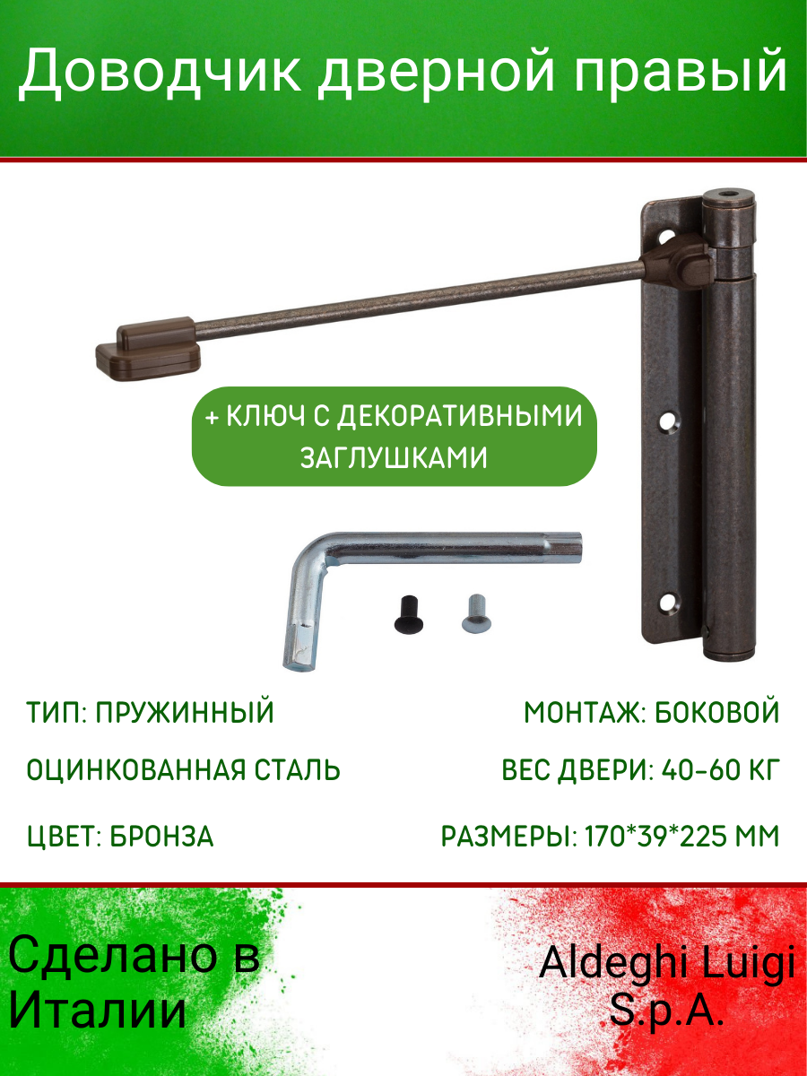 Доводчик дверной ALDEGHI LUIGI SpA правый, 170х39х225 мм, оцинкованная сталь, к-т: 1 шт + ключ с декоративными заглушками