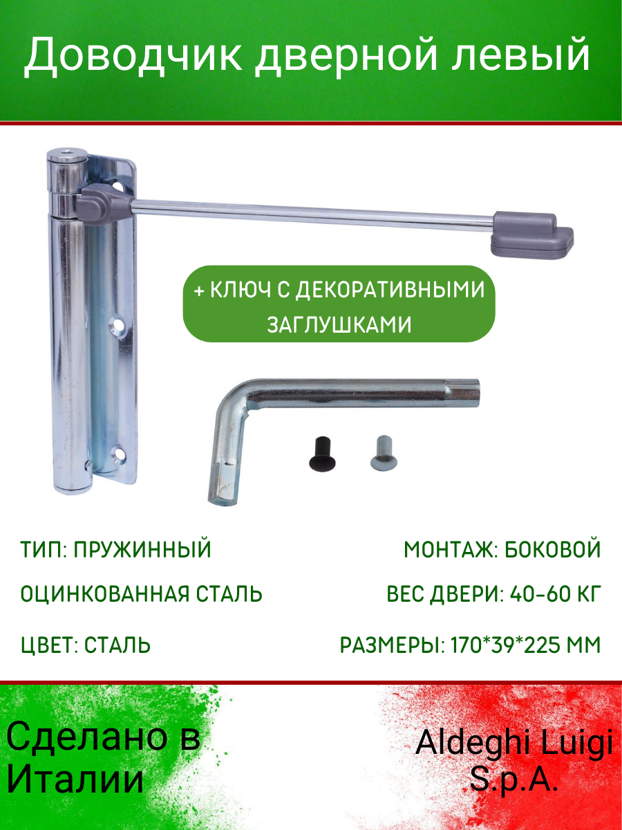Доводчик дверной ALDEGHI LUIGI SpA левый, 170х39х225 мм, оцинкованная сталь, к-т: 1 шт + ключ с декоративными заглушками