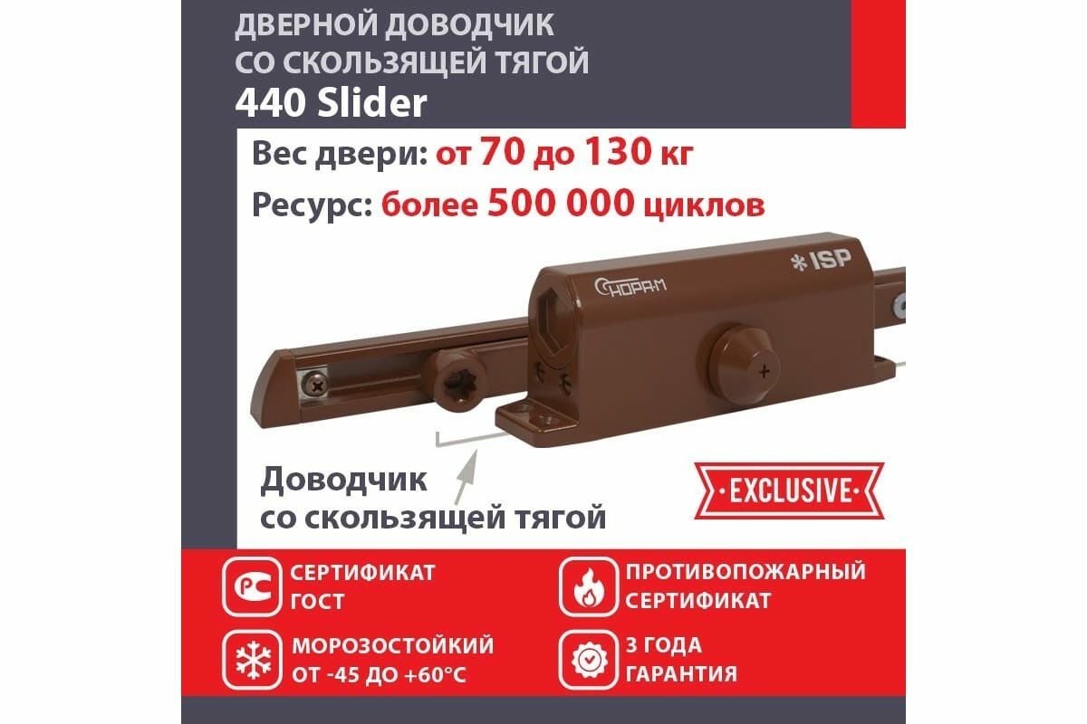 СохранитьДоводчик ISPARUS 440 Slider (70-130 кг) морозост.со скольз. тягой, коричневый интересное: