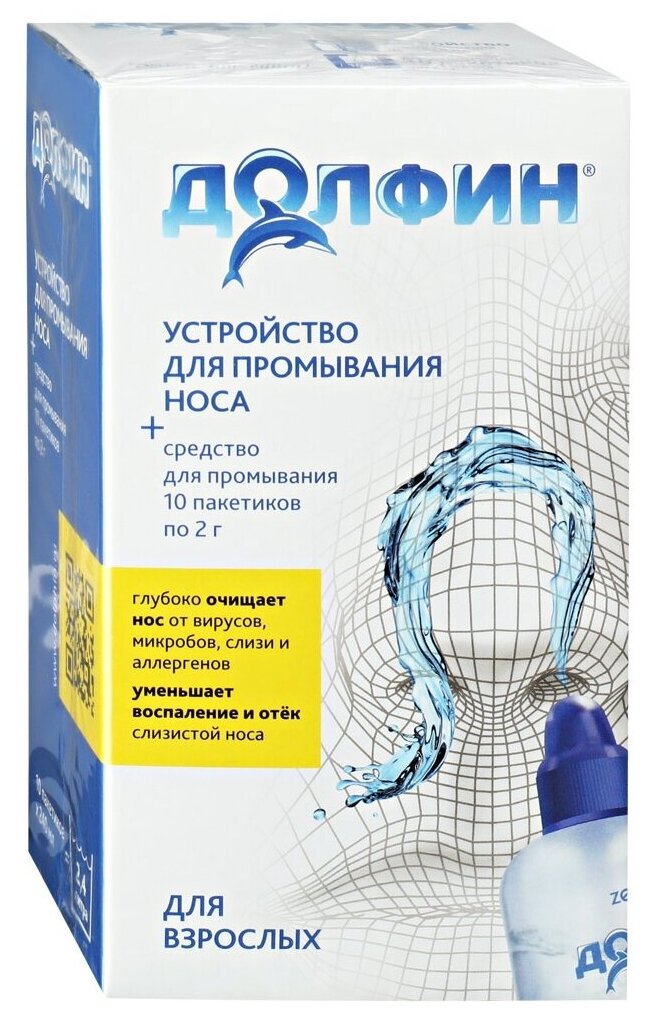 | Комплектация | - Уcтpoйcтвo для пpoмывaния нoca Дoлфин (флакон) 240 мл - Порошок для промывания 2 г пакетики (саше) - 10 шт. |
