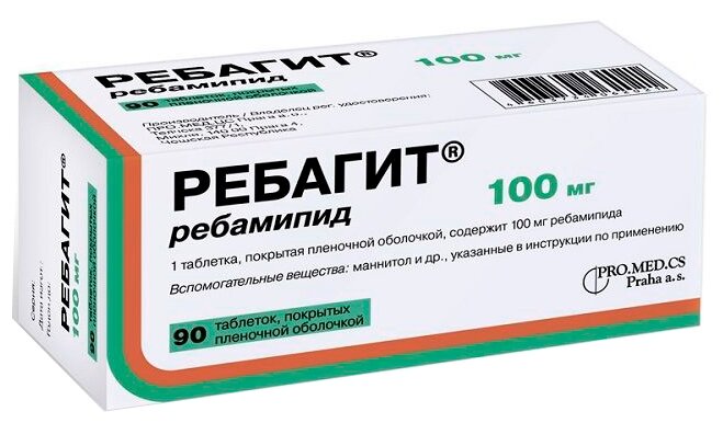 | Состав | Одна таблетка, покрытая пленочной оболочкой, содержит:действующее вещество: ядро: ребамипид 100,00 мгвспомогательные вещества: маннитол, кроскармеллоза натрия, крахмал прежелатинизированный, натрия лаурилсульфат, лимонная кислота, тальк, магния стеарат;пленочная оболочка: опадрай белый 03В28796 (гипромеллоза 6 сР, титана диоксид, макрогол 400). |