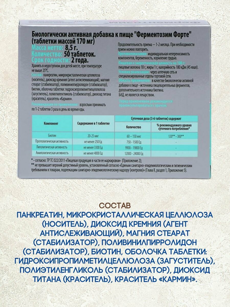 | Состав | Панкреатин, биотин, Е460, Е551, Е470, Е1201, оболочка таблетки (Е464, Е1521, Е171, Е120). |