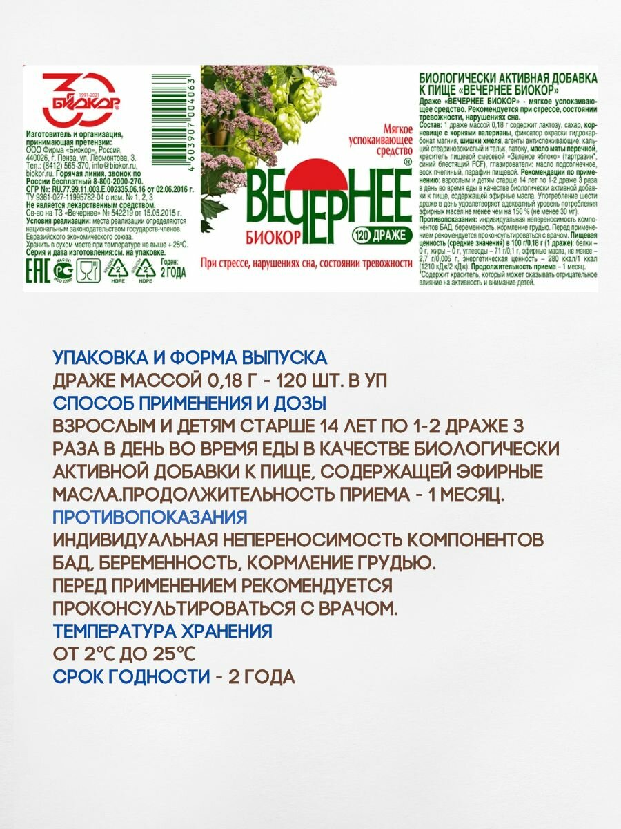 Вечернее Биокор драже массой 0,18 г 30 шт