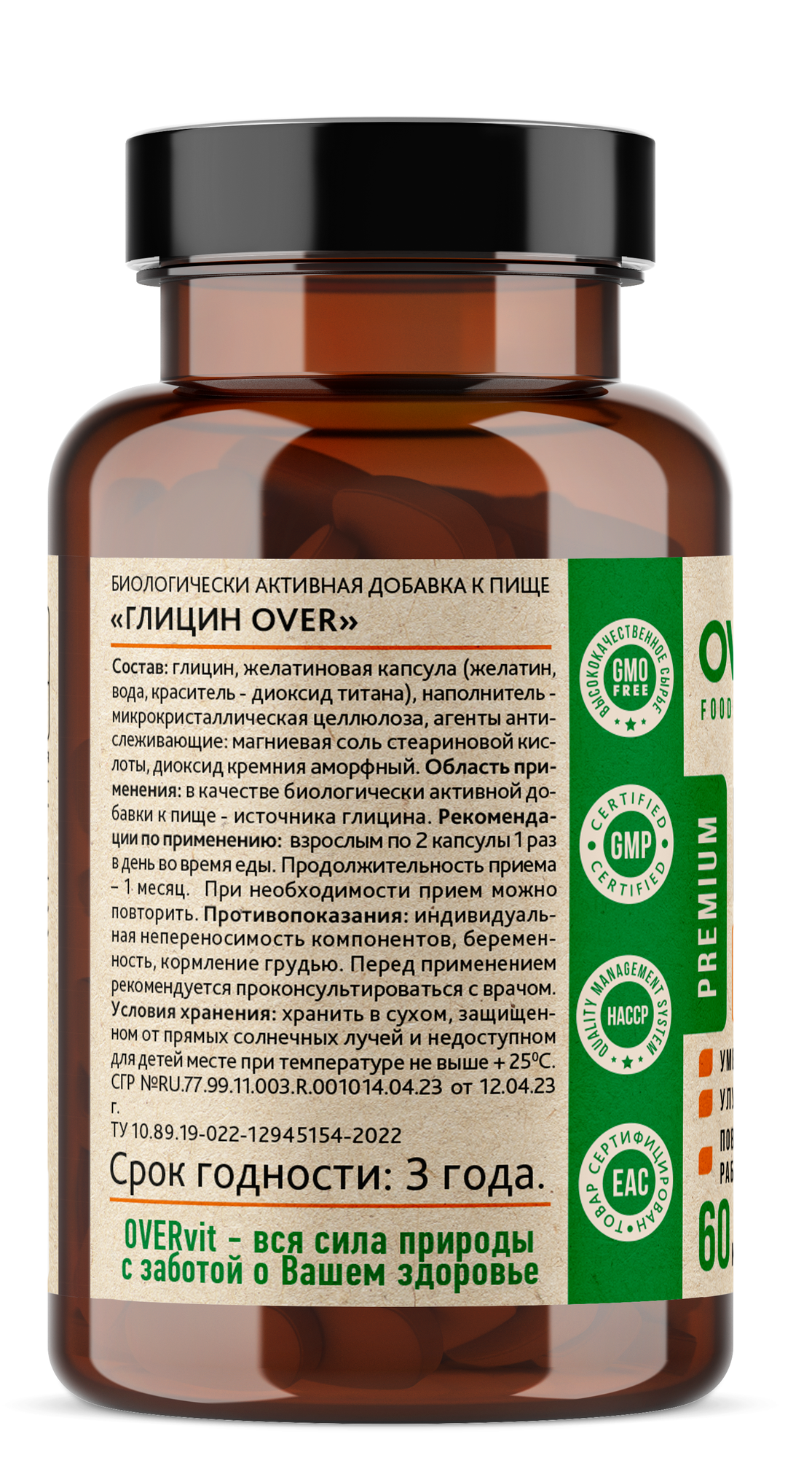 | Состав | Глицин, желатин, наполнитель - микрокристаллическая целлюлоза (Е 460(i)) , магниевая соль стеариновой кислоты (агент антислеживающий - Е470), краситель - диоксид титана (Е171) , диоксид кремния аморфный (агент антислеживающий -Е551). |