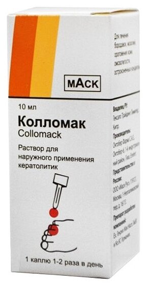 | Особые указания | Колломак нельзя наносить на слизистые оболочки, в особенности следует избегать попадания в глаза. Если это произошло, то следует промыть соответствующую область большим количеством воды.После употребления следует плотно закрыть флакон!Колломак следует наносить точно, избегая попадания его на окружающие здоровые участки. Для защиты окружающей ткани при необходимости рекомендуется использовать защитные пасту, мазь, крем. |