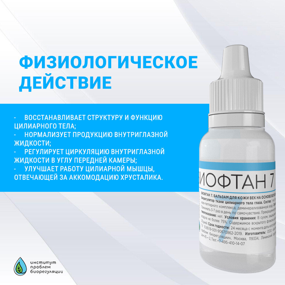 | Состав | 1 мл стерильного раствора содержит: деминерализованную воду 8,5±0,5 мг NaCI; 0,1±0,01 мг СаСI2 и 10-7-10-8 мг белково-пептидного комплекса, выделенного из ткани цилиарного тела глаз молодых бычков. |