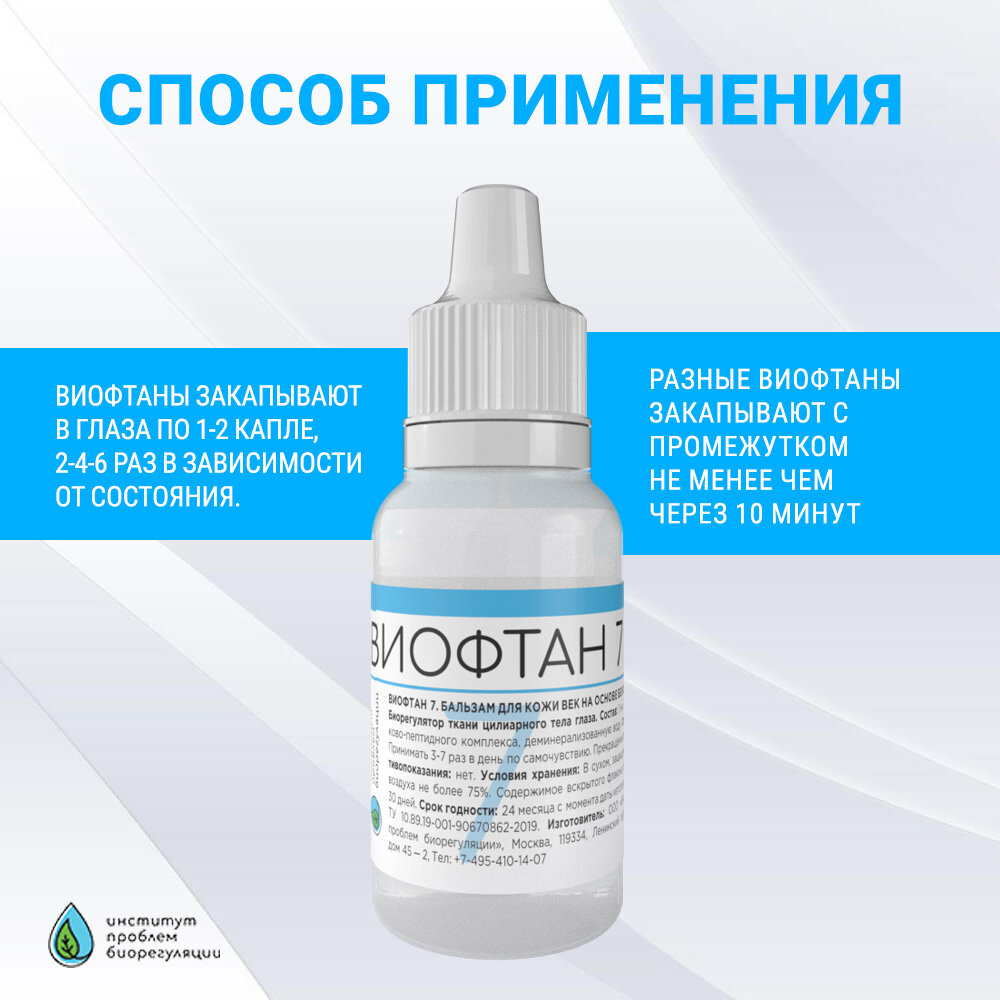 | Способ применения и дозы | Виофтаны закапывают в глаза по 1-2 капле, 2-4-6 раз в зависимости от состояния. Разные Виофтаны закапывают с промежутком не менее чем через 10 минут. |