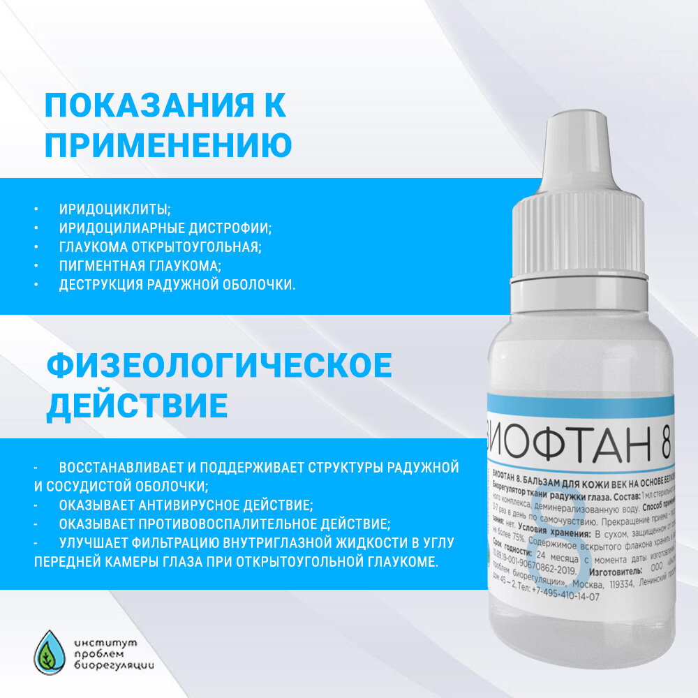| Состав | 1 мл стерильного раствора содержит: деминерализованную воду 8,5±0,5 мг NaCI; 0,1±0,01 мг СаСI2 и 10-8-10-9 мг белково-пептидного комплекса, выделенного из ткани радужной оболочки глаз молодых бычков. |