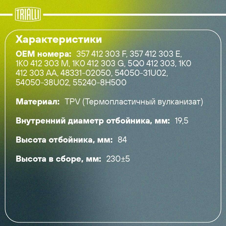 | Дополнительная информация | высота отбойника 84 мм, внутренний диаметр отбойника 19.5 мм, высота в сборе 230±5 мм |