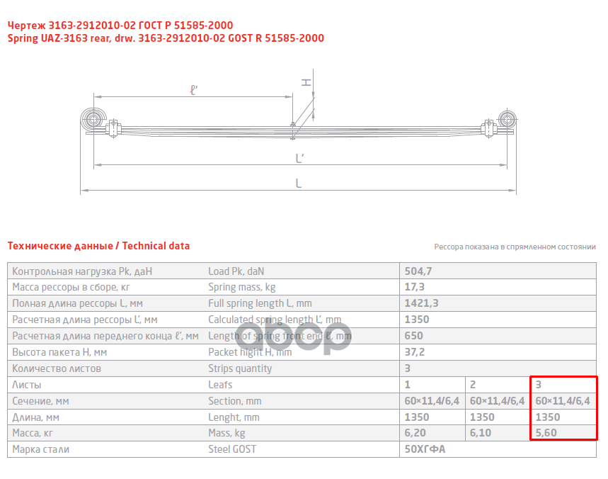 Лист №3 Рессора задняя для УАЗ 3163 Patriot 3 листа интересное: