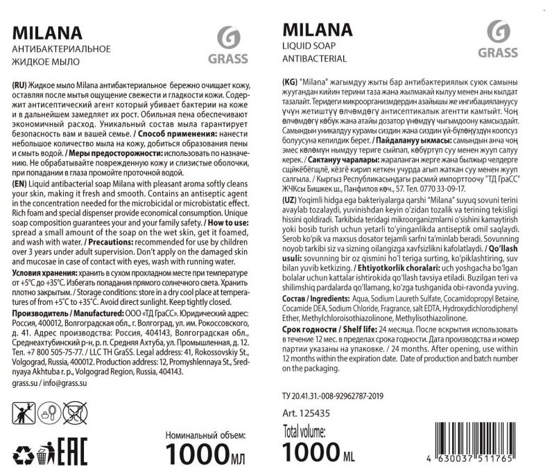 Grass жидкое крем-мыло milana «антибактериальное», 1л, GRASS 125435 (1 шт.)