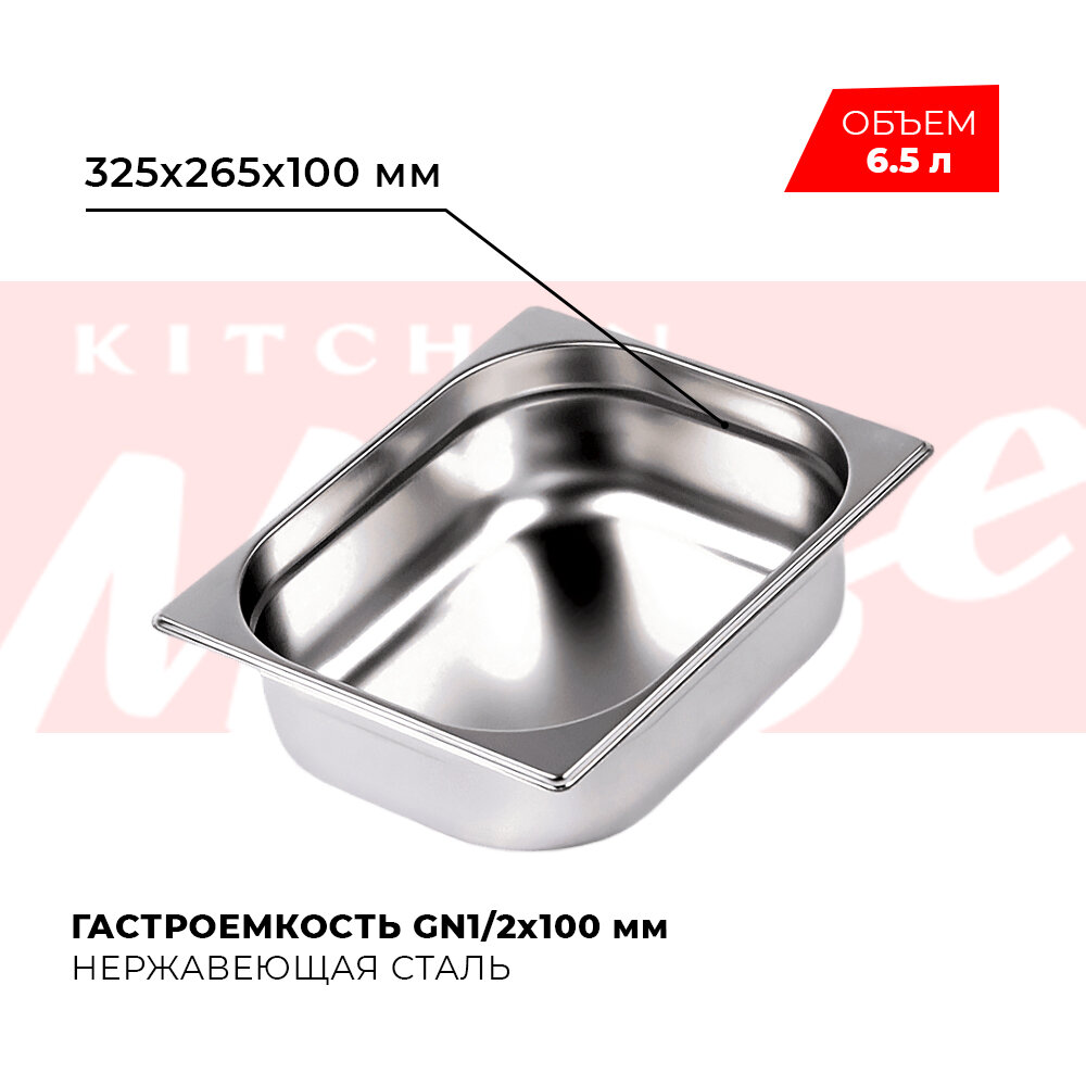 Гастроемкость Kitchen Muse GN 1/2 100 мм, мод. 812-4, нерж. сталь, 325х265х100 мм. Металлический контейнер для еды. Пищевой контейнер из нержавеющей стали интересное: