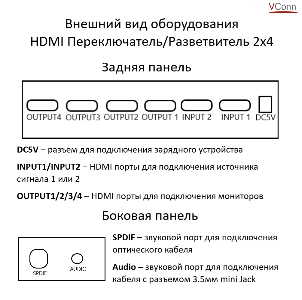 Переключатель/Разветвитель HDMI 2х4 + audio Ultra HD V2.0 (4Кх2К,3D) /VConn/ интересное: