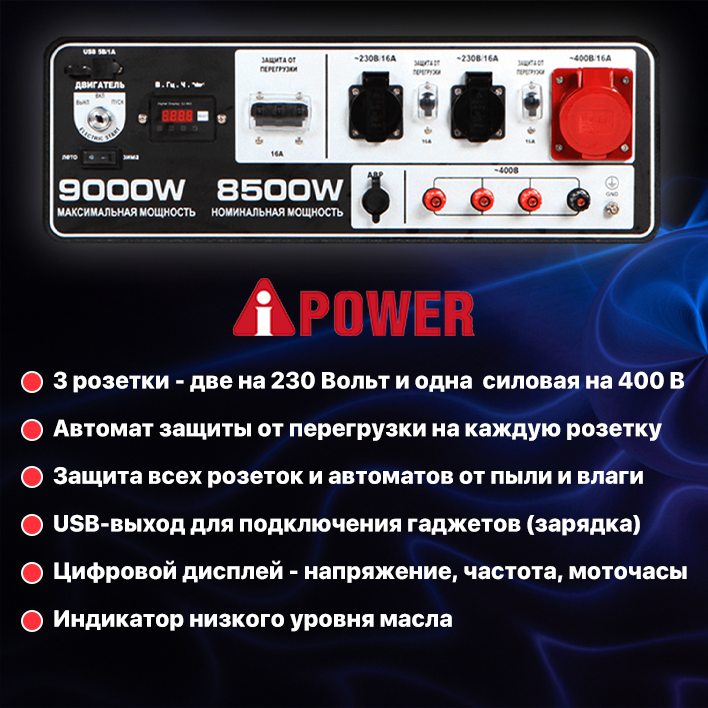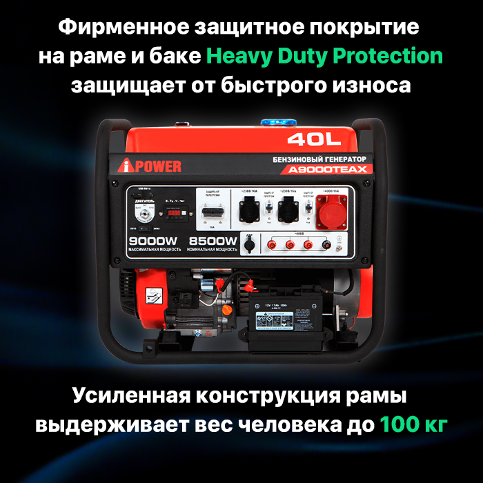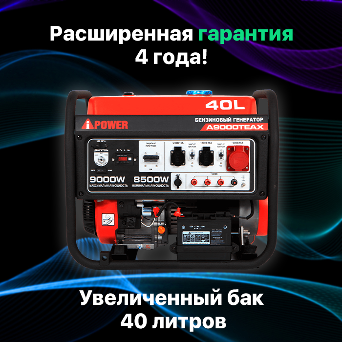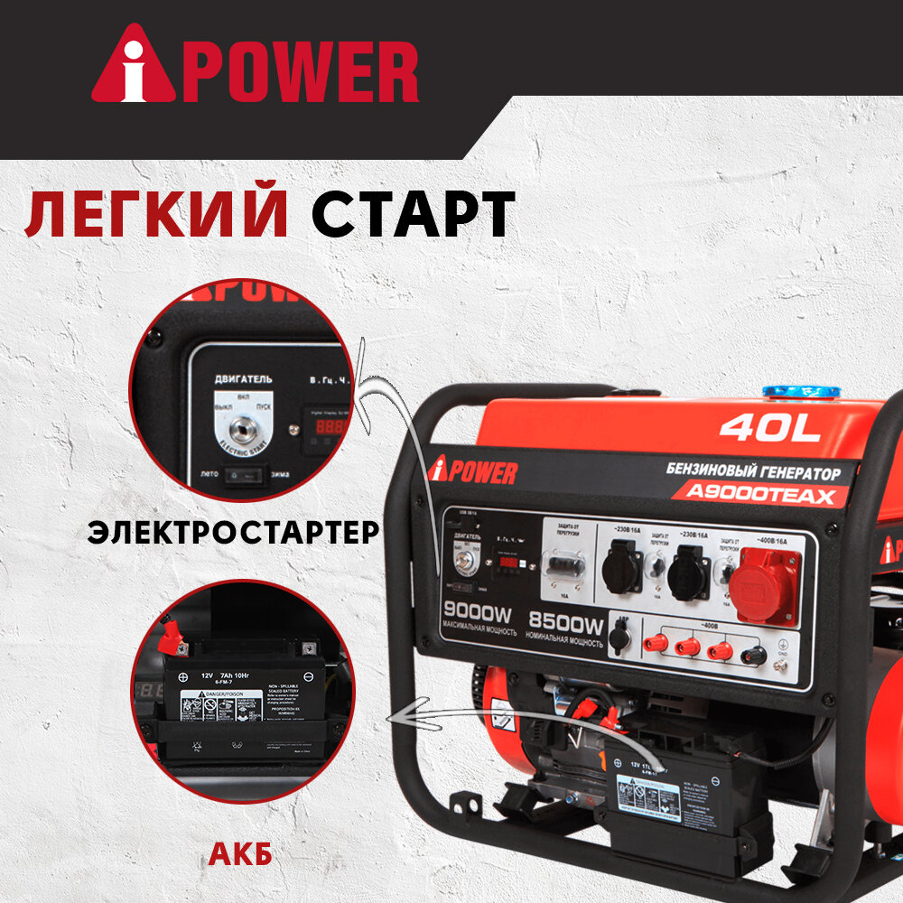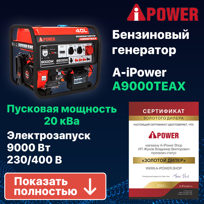 Бензиновый генератор A-iPower A9000TEAX, 9кВт, 400В, с электростартером. Пусковая мощность 20кВA интересное: