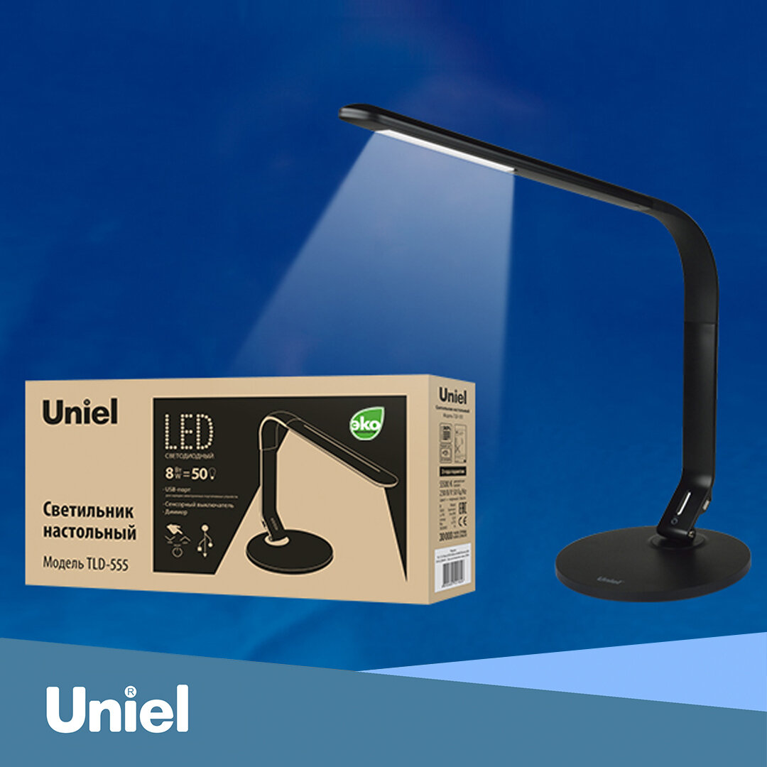 Настольная лампа TLD-555 BLACK/8W/LED/500LM/5500K USB диммер сенсор черный UNIEL