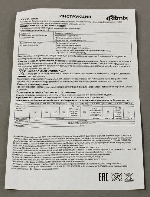Клавиатура RITMIX RKB-107 клавиш: 104, черный интересное: