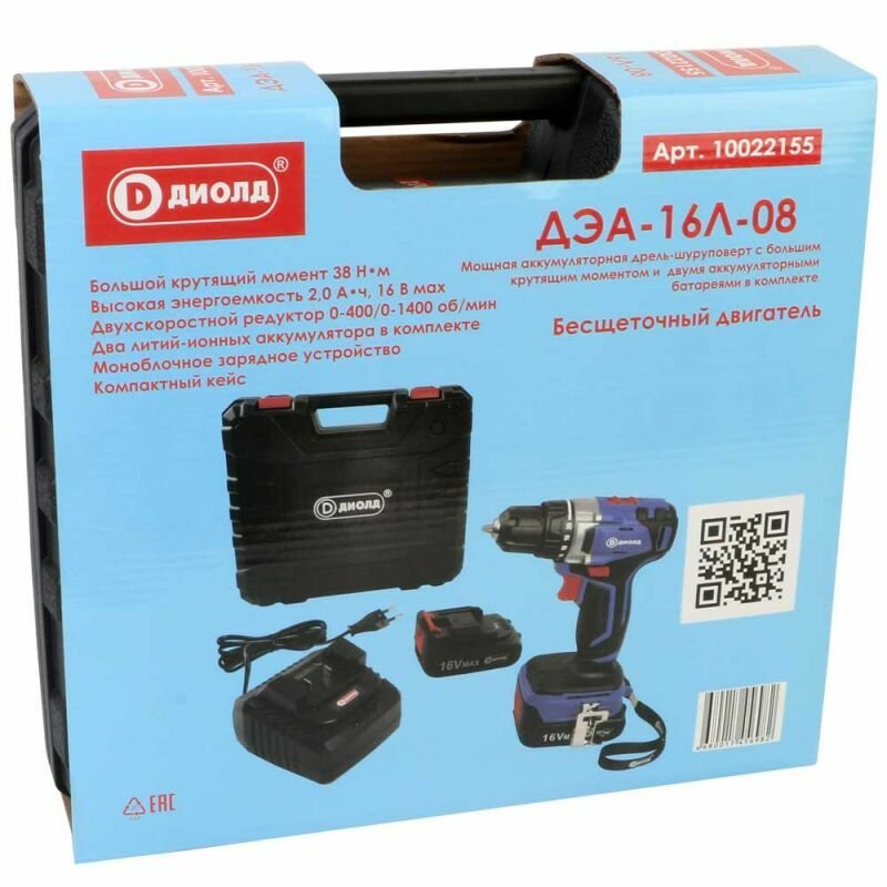 Дрель-шуруповерт аккумуляторная диолд ДЭА-16Л-08, кейс, бесщеточный двигатель, 2 аккум., 2 скорости, плавное изменение оборотов, реверс, Li-ion, 16В, 0-1400 об/мин