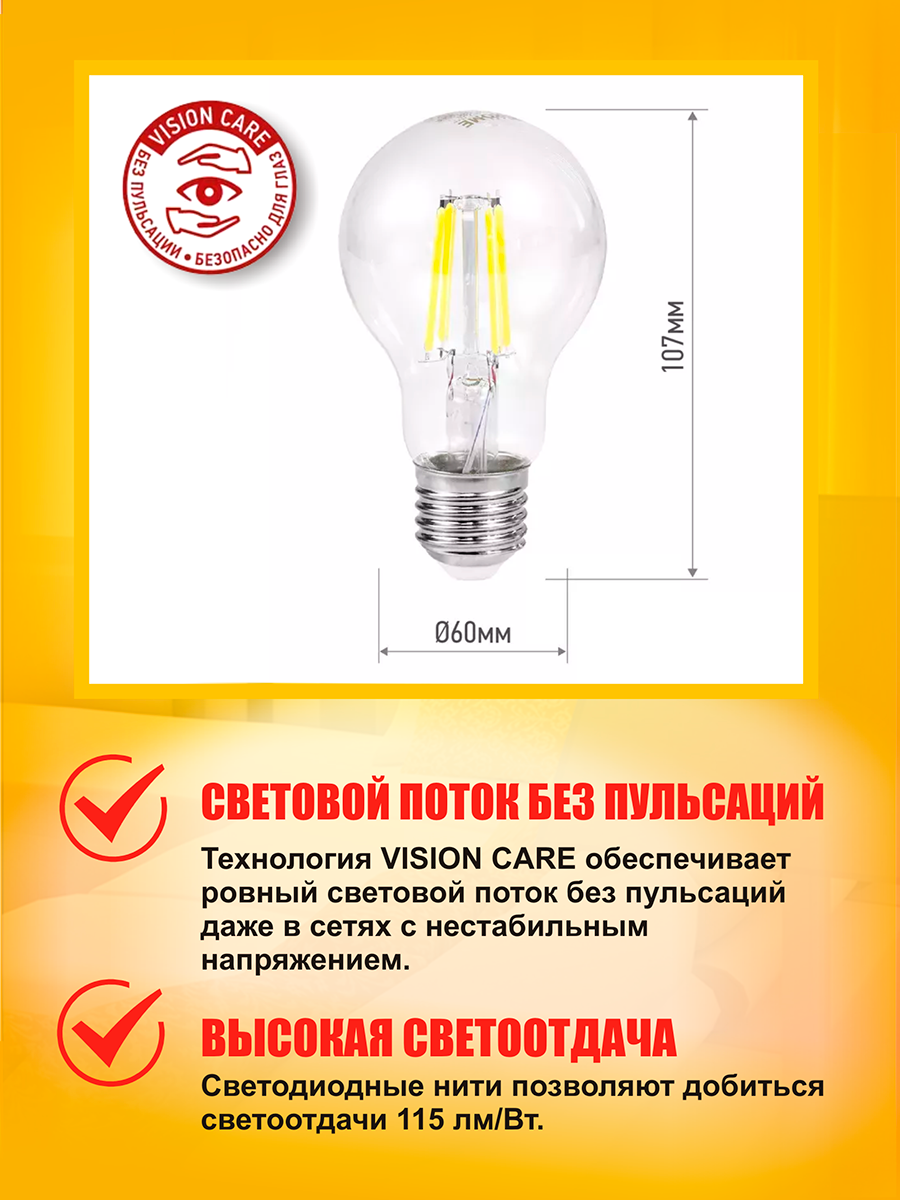 Светодиодная LED лампа нитевидная IN HOME A60 E27(е27) 9W (Вт) 3000K 810lm 107x60 220V filament прозрачная 4690612008066
