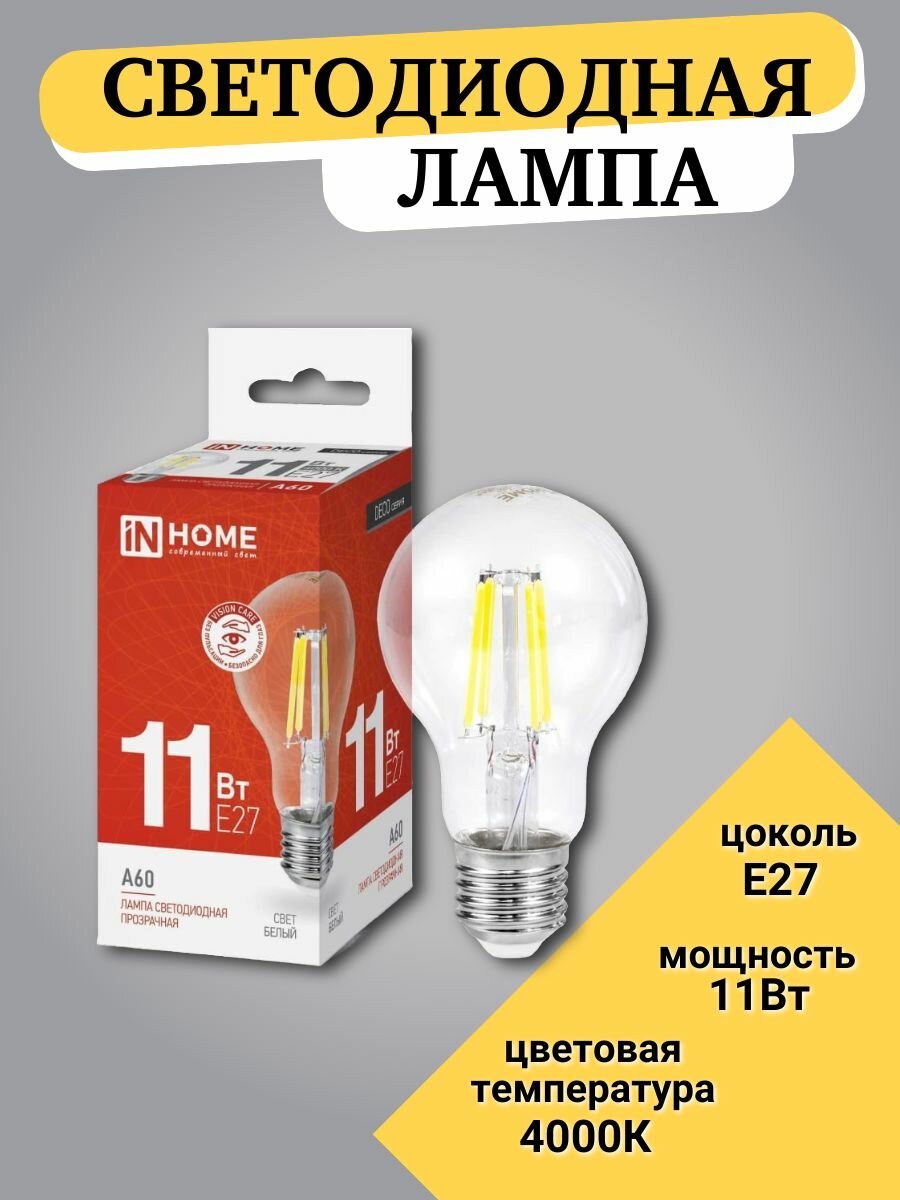 Лампа светодиодная IN HOME LED-A60-deco, 11 Вт, 230 В, Е27, 4000 К, 1160 Лм, прозрачная