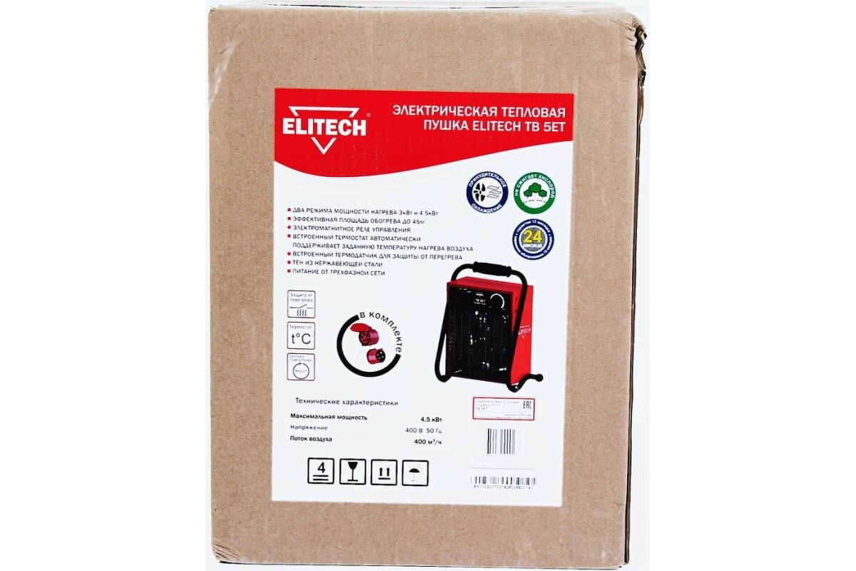 Тепловая электрическая пушка ELITECH ТВ 5ЕТ 380В,3000-4500Вт,поток-400м3\ч,термостат,силовая вилка+розетка